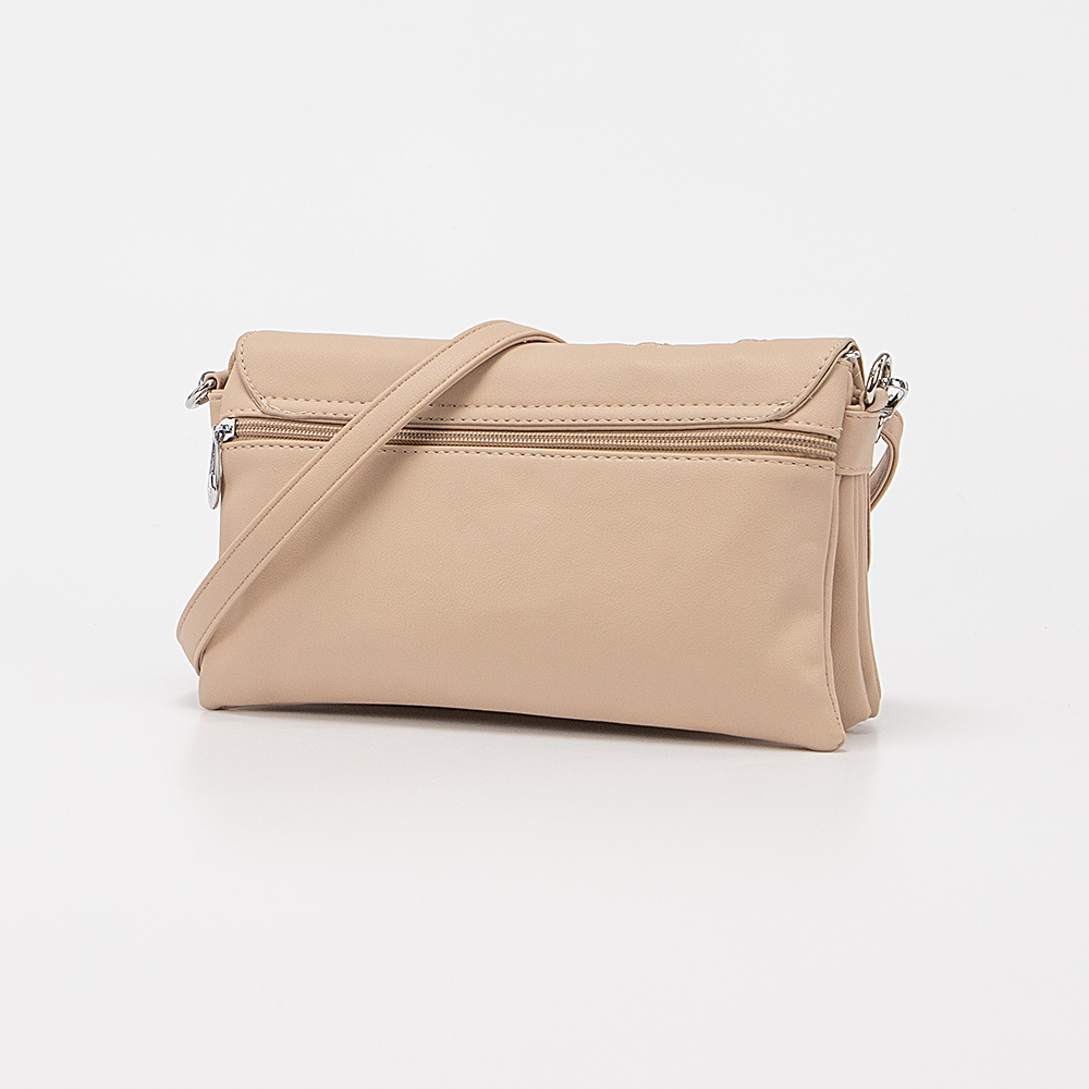 Сумка от торговой марки Passo Avanti из искусственной кожи бежевого цвета. Модель со съемным регулируемым плечевым ремнем. Закрывается клапаном на двух магнитных кнопках; клапан декорирован двумя декоративными молниями. Отделение закрывается молнией. Внутри: пять отсеков с текстильной подкладкой; средний отсек на молнии, в переднем – накладной карман. На задней стороне – карман на молнии.