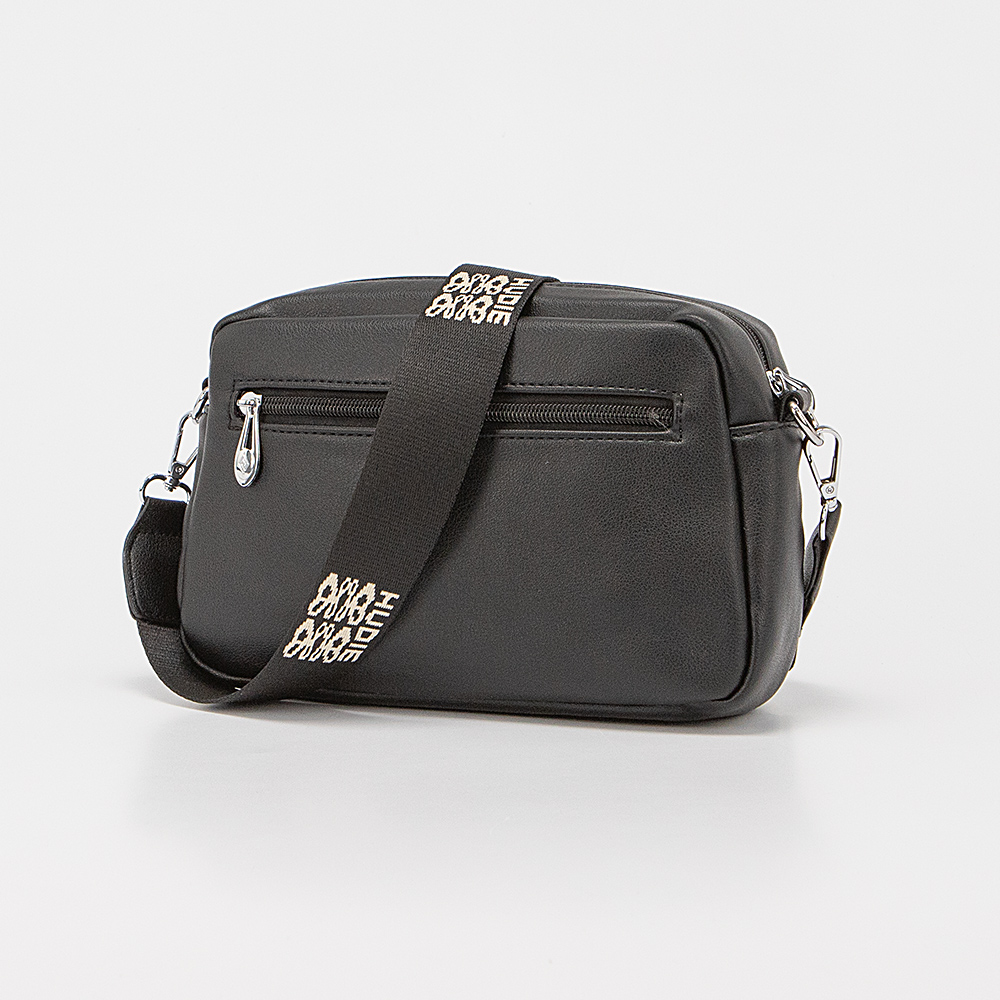 Сумка от торговой марки Passo Avanti из искусственной кожи черного цвета. Модель с широким съемным регулируемым плечевым ремнем, выполненным из текстильного материала с оригинальным рисунком. Отделение на молнии. Внутри: текстильная подкладка, карман на молнии, накладной карман. На лицевой стороне – два кармана на молнии. На задней стороне – карман на молнии.