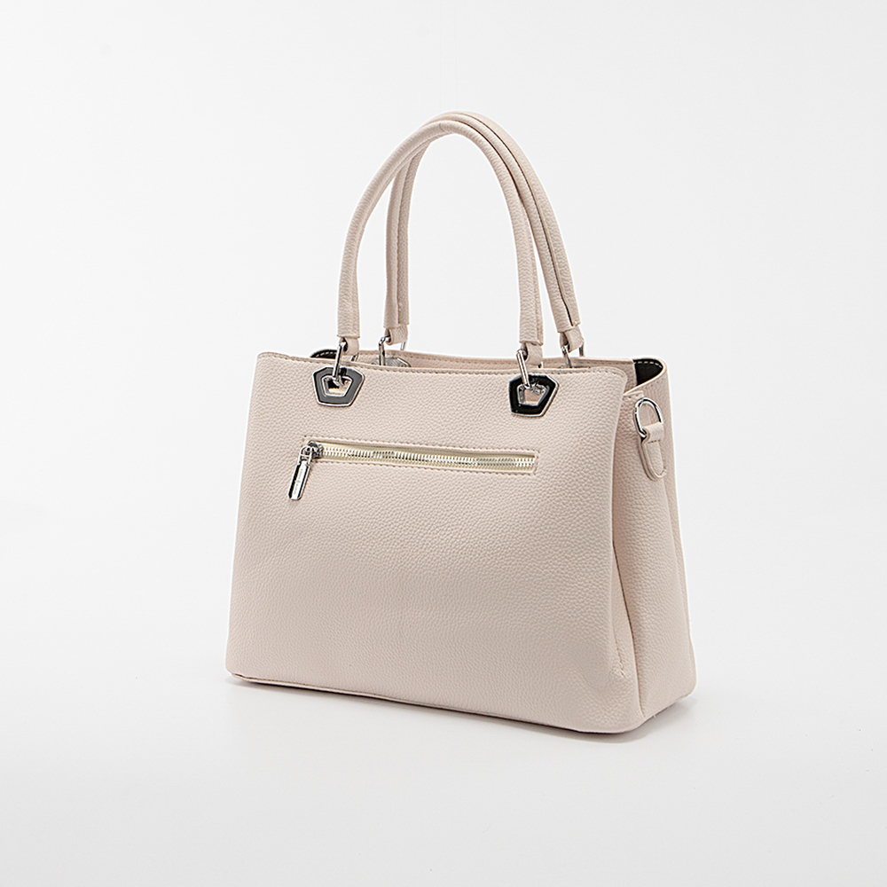 "Сумка от торговой марки Passo Avanti из искусственной кожи бежевого цвета. Модель с двумя удлиненными ручками. Закрывается молнией; широко раскрывается. Внутри: три отделения с текстильной подкладкой; в среднем – карман на молнии, накладной карман. На задней стороне – карман на молнии. На дне имеются нашивки для защиты от износа."