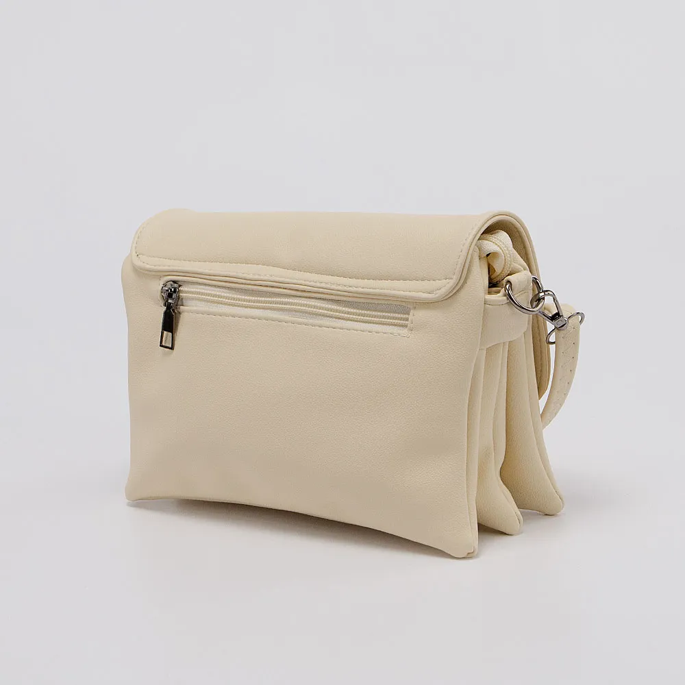 Сумка от торговой марки Passo Avanti из искусственной кожи бежевого цвета. Модель со съемным регулируемым плечевым ремнем. Закрывается клапаном на магнитной кнопке. Отделение на молнии. Внутри: 5 отсеков, три из которых с текстильной подкладкой; средний отсек на молнии, в переднем – накладной карман. На задней стороне – карман на молнии.