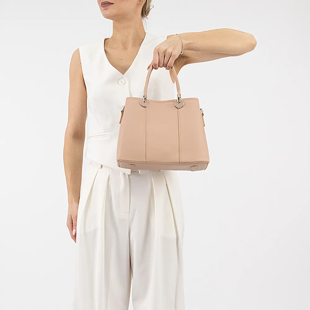 Сумка от торговой марки Passo Avanti из искусственной кожи бежевого цвета. Модель с двумя плотными ручками и съемными регулируемым плечевым ремнем. Три отделения с частичной подкладкой. Крайние фиксируются магнитной кнопкой. Среднее отделение на молнии. Внутри: карман на молнии. На дне имеются нашивки для защиты от износа.