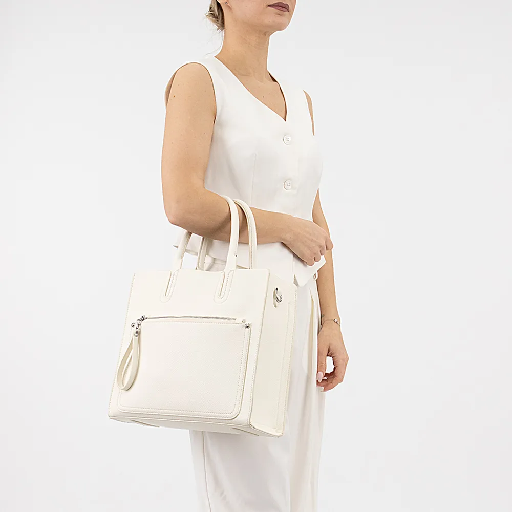 Сумка от торговой марки Passo Avanti из искусственной кожи голубого цвета. Модель с двумя плотными ручками и съемными регулируемым плечевым ремнем. Три отделения с частичной подкладкой; крайние без застежки. Среднее отделение на молнии. Внутри: карман на молнии, накладной карман. На дне имеются нашивки для защиты от износа.