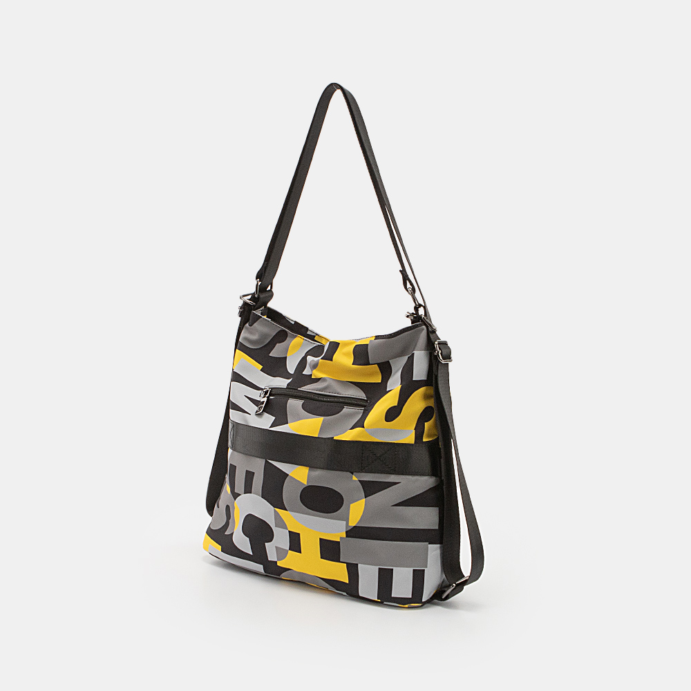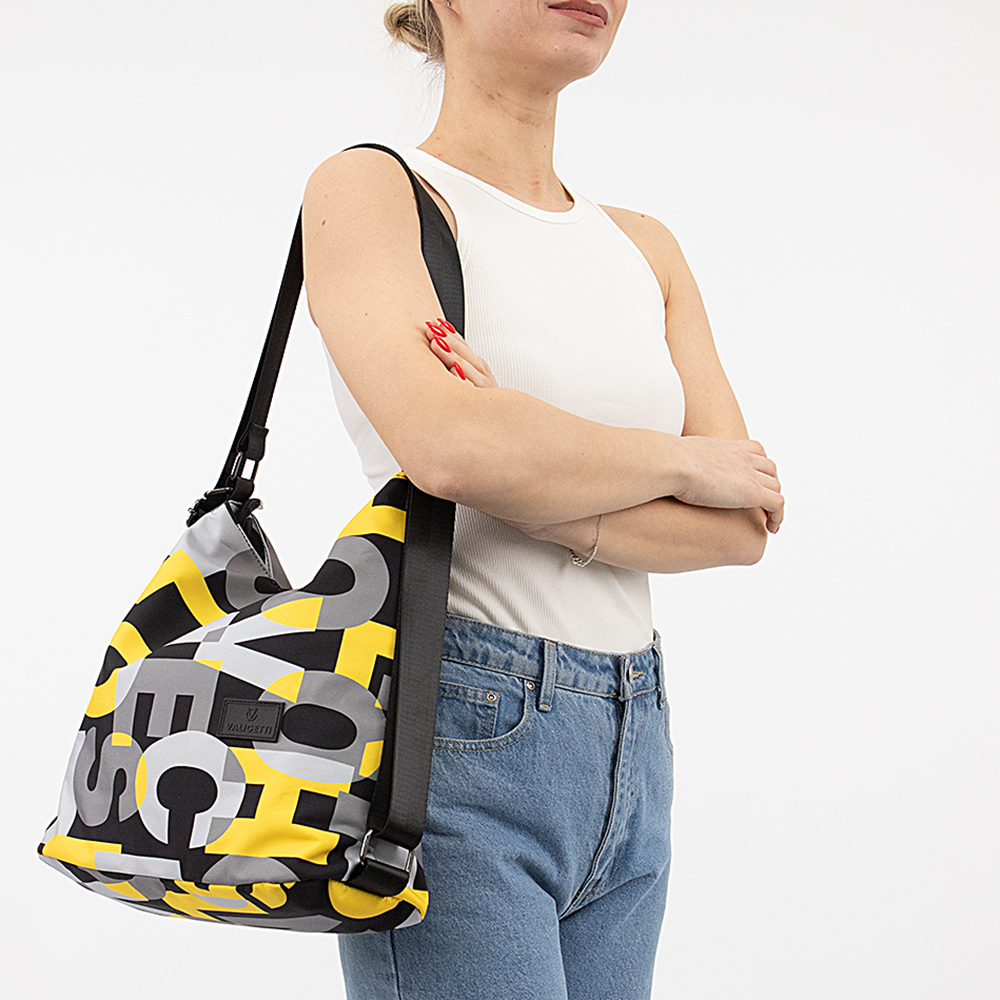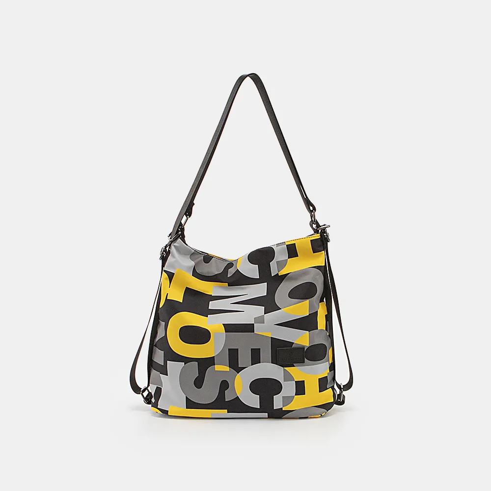 Сумка-рюкзак от торговой марки Valigetti из практичного материала с глянцевым блеском и оригинальным текстовым принтом. Модель с двумя ручками, которые стягиваются в плечевые лямки. Отделение на молнии. Внутри: текстильная подкладка, карман на молнии, два накладных кармана. На задней стороне – карман на молнии, лямка для фиксации на выдвижную ручку чемодана. Молодежная текстильная коллекция представлена моделями, выполненными из трех видов материалов: прочной ткани рип-стоп, блестящего и матового текстиля. Фурнитура повышенной прочности обеспечивает плавность движения замка и долговечность использования.