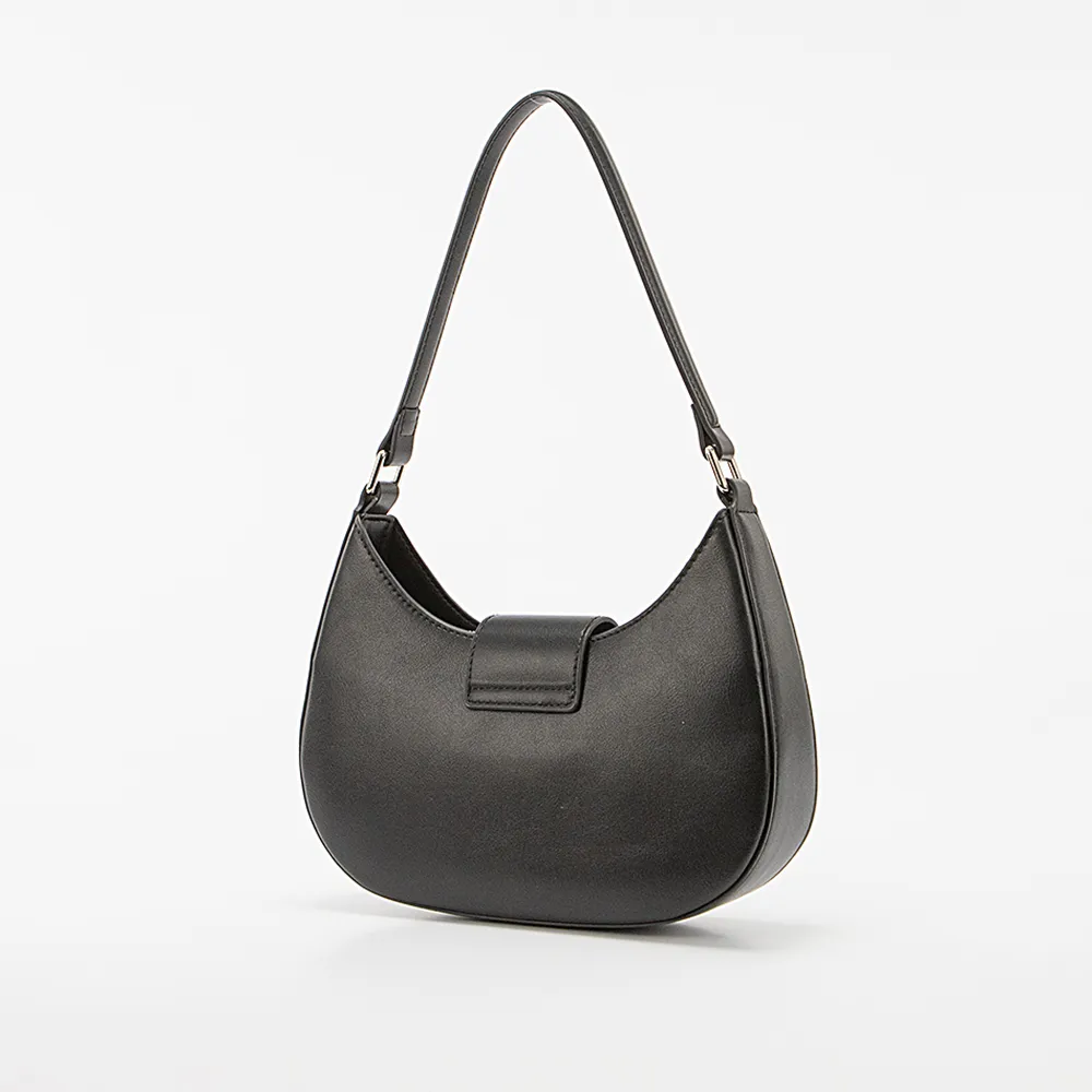 Сумка от торговой марки David Jones из искусственной кожи черного цвета. Элегантная модель с удлиненной ручкой и съемным регулируемым плечевым ремнем. Закрывается хлястиком на поворотном замке. Отделение на молнии. Внутри: частичная фирменная подкладка, карман на молнии.