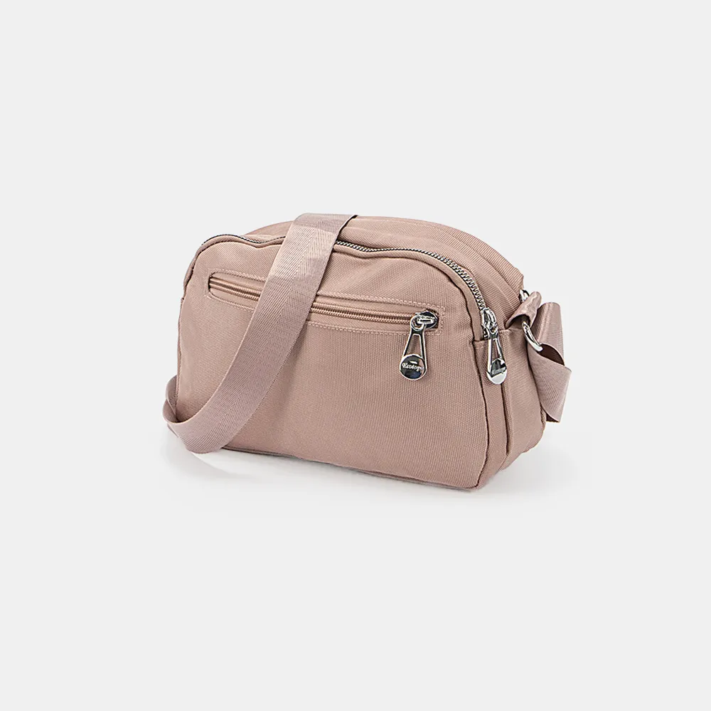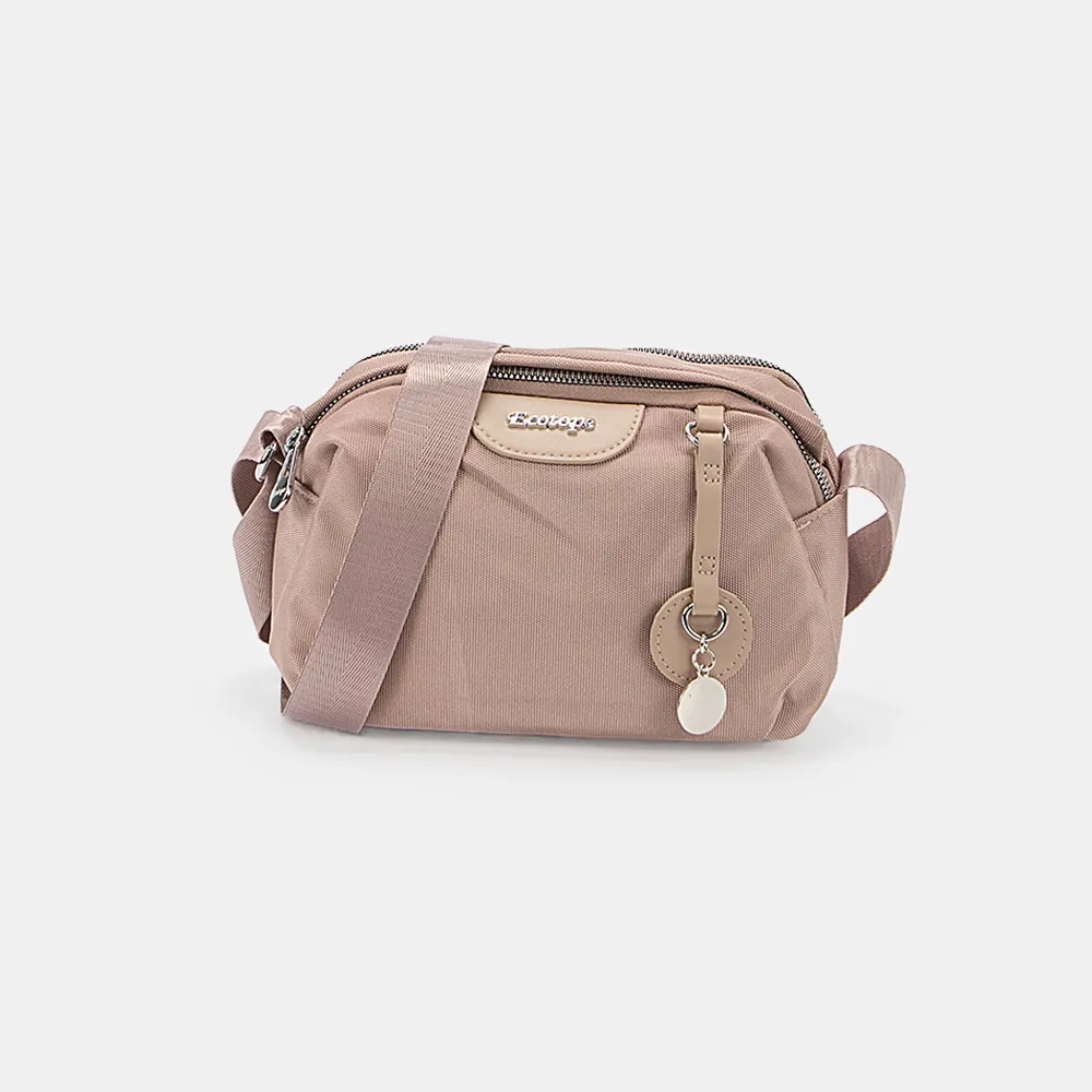 Сумка от торговой марки Ecotope из практичного текстильного материала бежевого цвета и вставками из искусственной кожи. Модель с несъемным регулируемым плечевым ремнем. Два отделения на молнии, с текстильной подкладкой. В заднем отделении – карман на молнии. На задней стороне – карман на молнии. Лицевая сторона декорирована оригинальной подвеской.