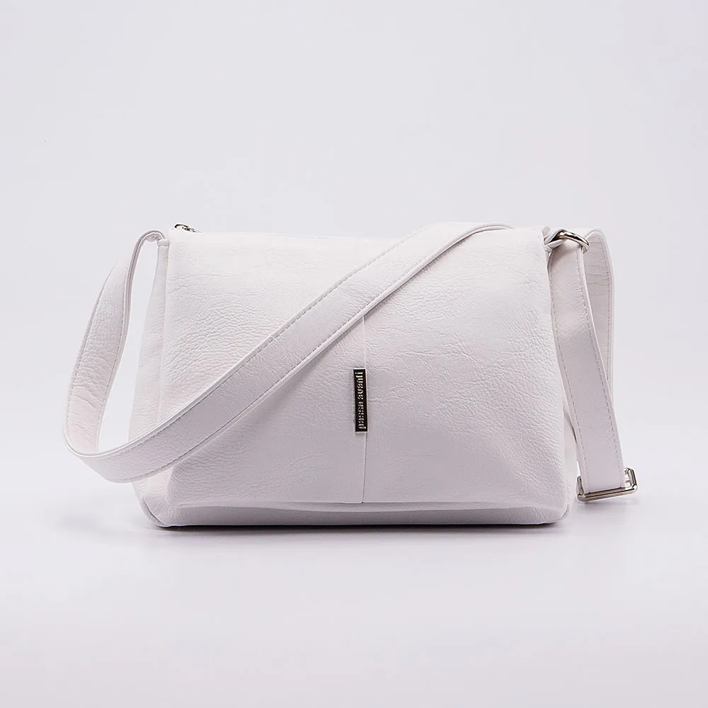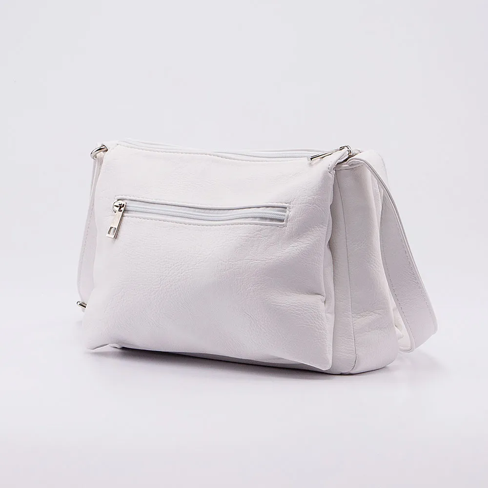 Сумка от торговой марки Passo Avanti из искусственной кожи белого цвета. Модель среднего размера, с несъемным широким регулируемым плечевым ремнем. Закрывается на молнию. Внутри: три отсека с текстильной подкладкой; в среднем – два накладных кармана. На задней стороне – карман на молнии.
