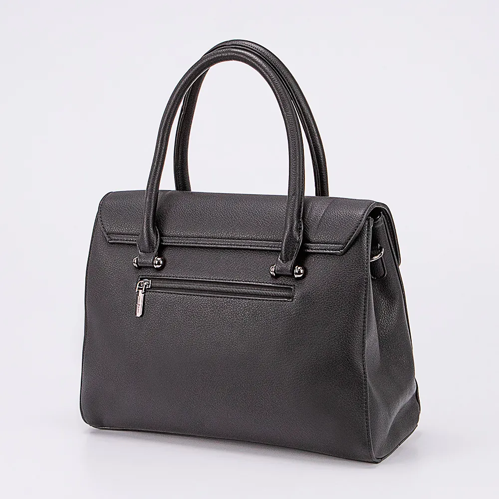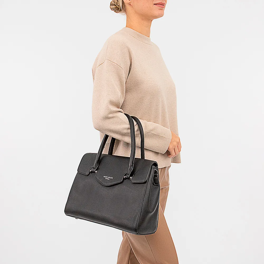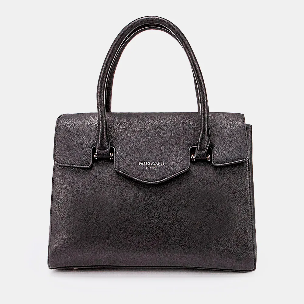 Сумка от торговой марки Passo Avanti из искусственной кожи черного цвета. Модель с двумя плотными ручками и съемным регулируемым плечевым ремнем. Закрывается фигурным клапаном на магнитной кнопке. Отделение на молнии. Внутри: текстильная подкладка, средник и карман на молнии, два накладных кармана. На задней стороне – карман на молнии. Дно оснащено металлическими ножками для защиты от износа.