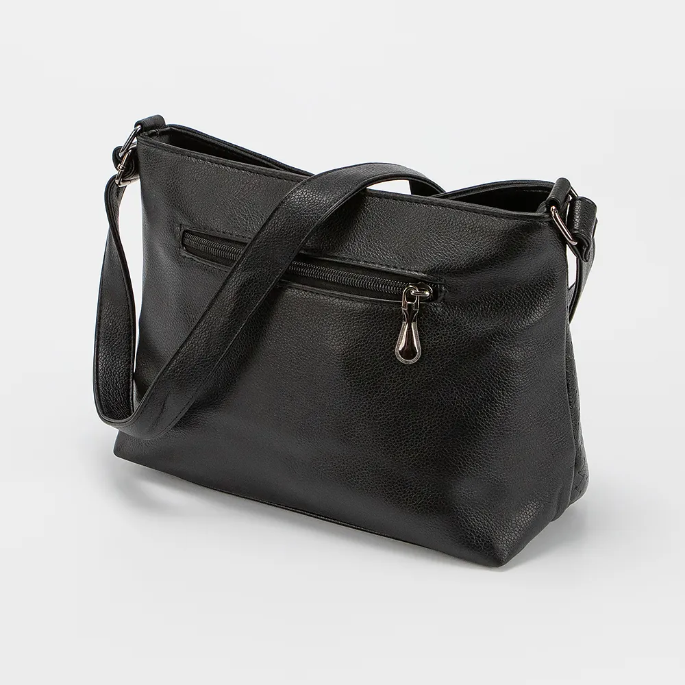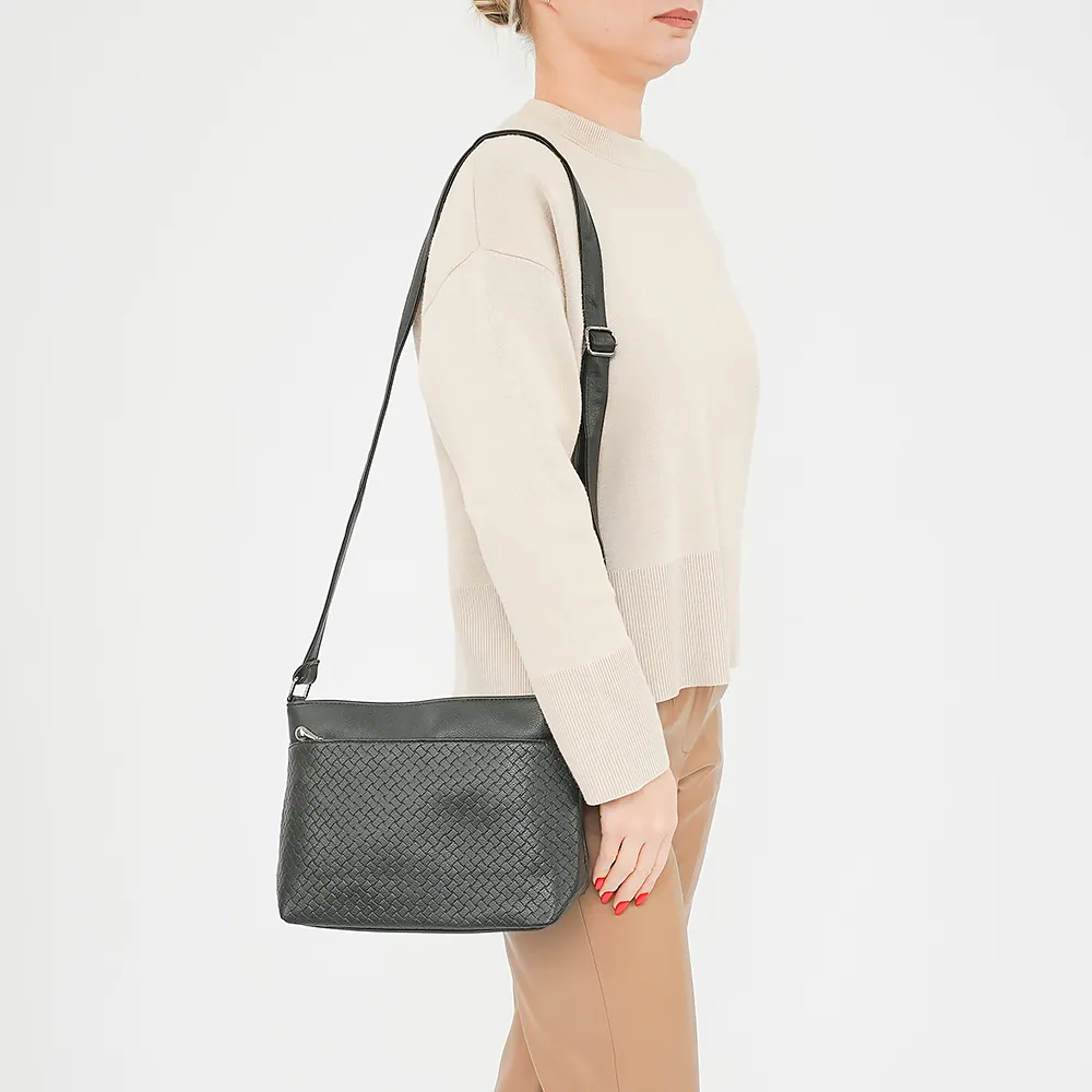 Сумка от торговой марки Passo Avanti из искусственной кожи с тиснением под плетение. Модель с несъемным регулируемым плечевым ремнем. Два отделения на молнии, с текстильной подкладкой; в одном из них – карман на молнии, в другом – накладной карман. На лицевой и задней стороне – карман на молнии.