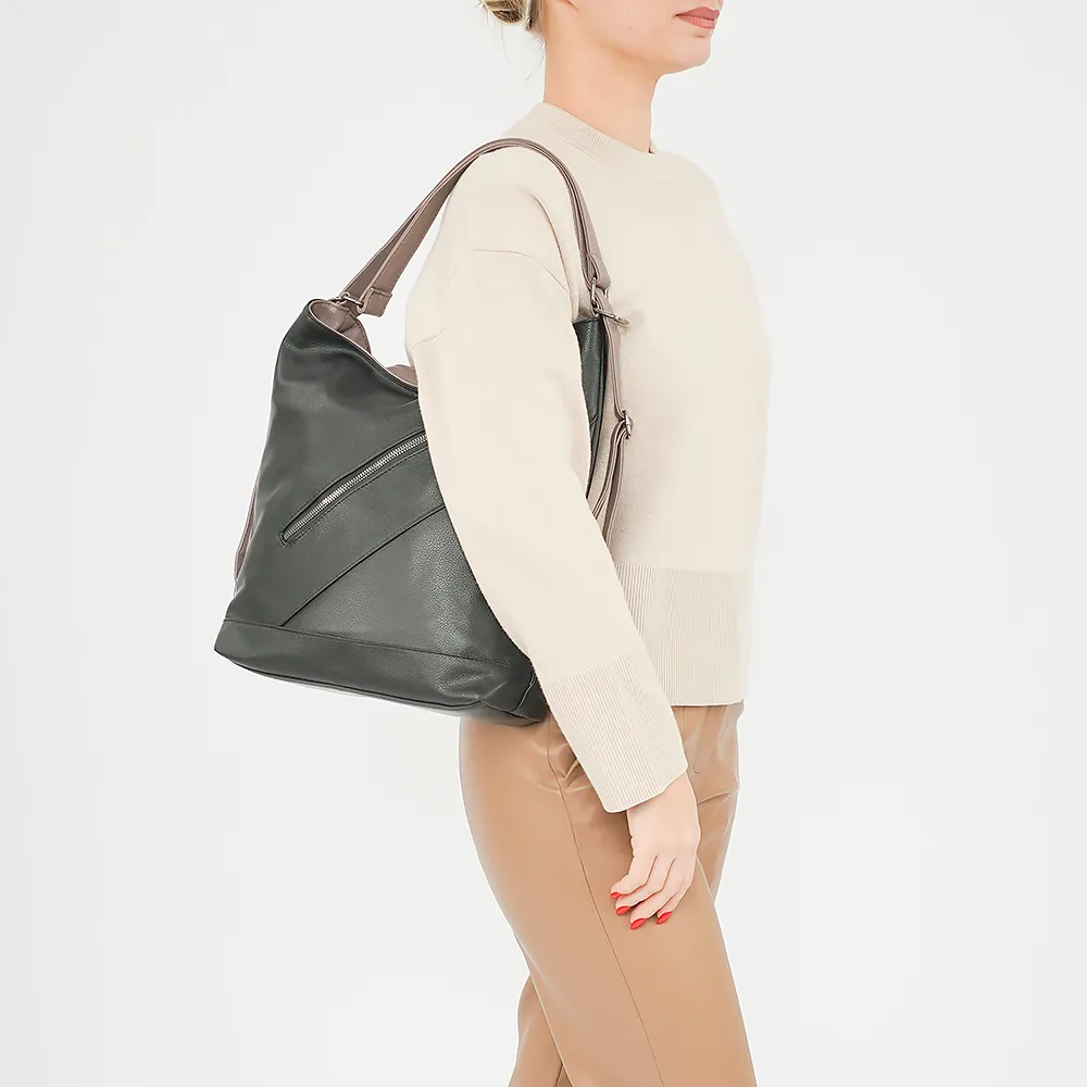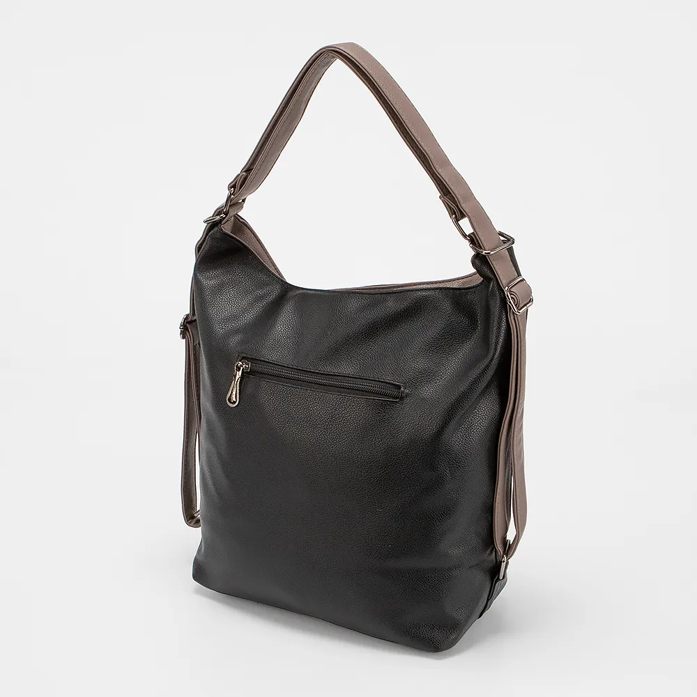 Сумка-рюкзак от торговой марки Passo Avanti из искусственной кожи. Модель с двумя ручками, стягиваемыми в плечевые лямки. Отделение на молнии. Внутри: текстильная подкладка, средник и карман на молнии, два накладных кармана. На лицевой и задней сторонах – карман на молнии.