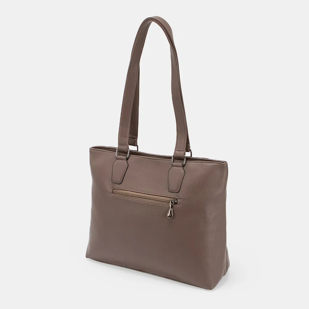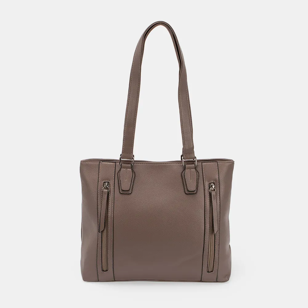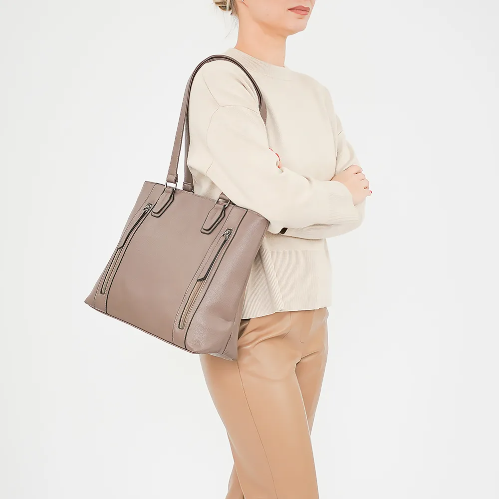 Сумка от торговой марки Passo Avanti из искусственной кожи. Модель с двумя удлиненными ручками. Отделение на молнии. Внутри: текстильная подкладка, средник и карман на молнии, два накладных кармана. На лицевой стороне – два кармана на молнии. На задней стороне – карман на молнии.
