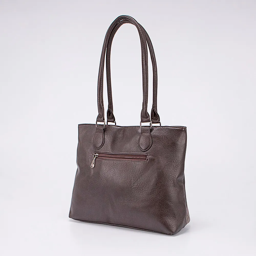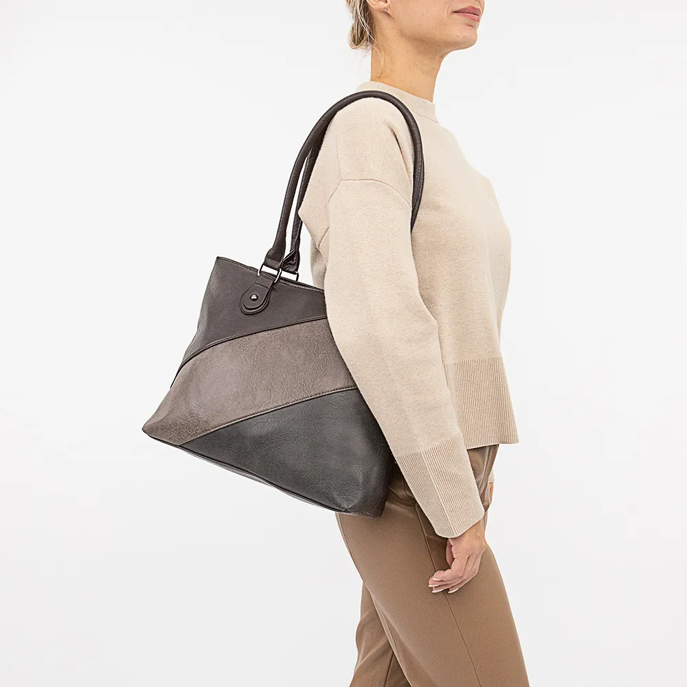 Сумка от торговой марки Passo Avanti из искусственной кожи в оттенках коричневого цвета. Лицевая сторона декорирована вставками. Вместительная модель с двумя удлиненными ручками. Два отделения на молнии, с текстильной подкладкой. В заднем отделении – карман на молнии, в переднем – накладной карман. На задней стороне – карман на молнии.