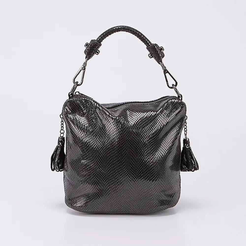 Сумка от торговой марки Passo Avanti из искусственной кожи черного цвета с эффектной лазерной обработкой и тиснением под рептилию. Модель со съемной ручкой и съемным регулируемым плечевым ремнем. Отделение на молнии. Внутри: фирменная подкладка, средник и карман на молнии, два накладных кармана. По бокам – карман на молнии с оригинальный пуллером-цепочкой.