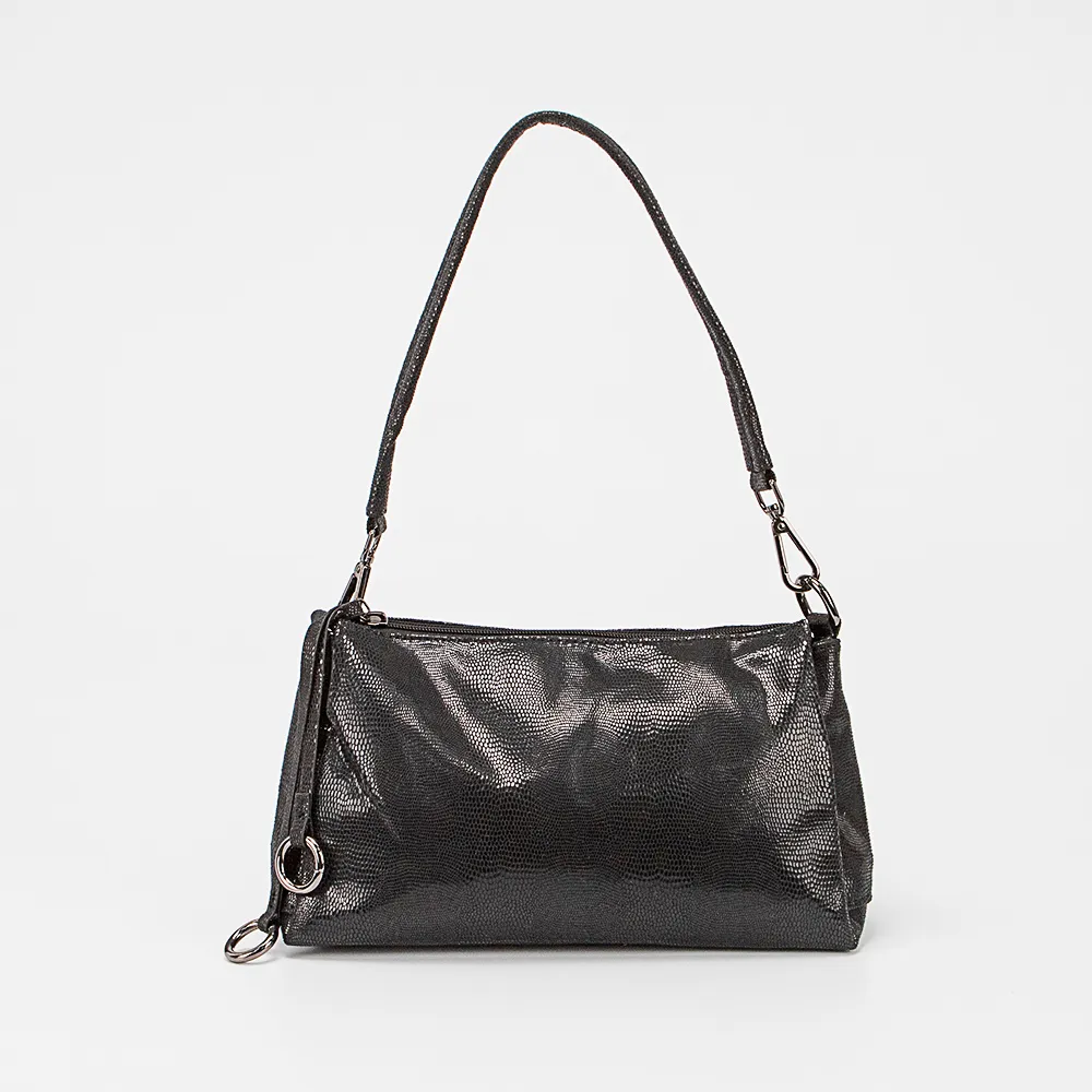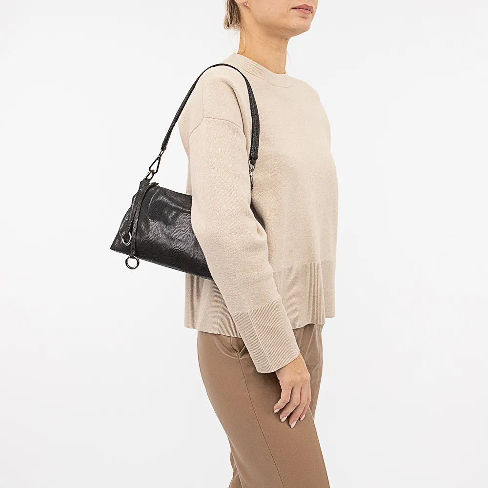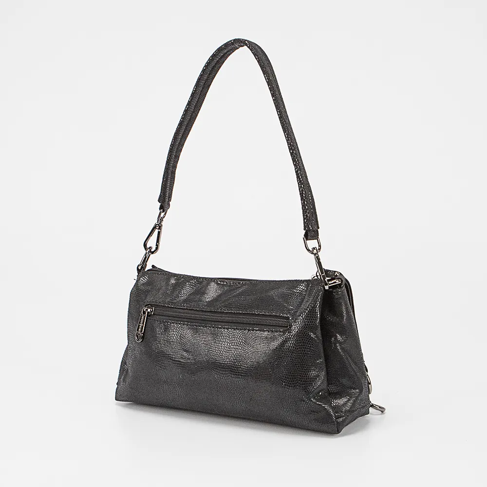 Сумка от торговой марки Passo Avanti из искусственной кожи черного цвета с эффектной лазерной обработкой и тиснением под рептилию. Модель с удлиненной съемной ручкой и съемным регулируемым плечевым ремнем. Закрывается молнией. Внутри: три отсека с фирменной подкладкой; средний отсек на молнии с карманом на молнии и накладным карманом. На задней стороне – карман на молнии.