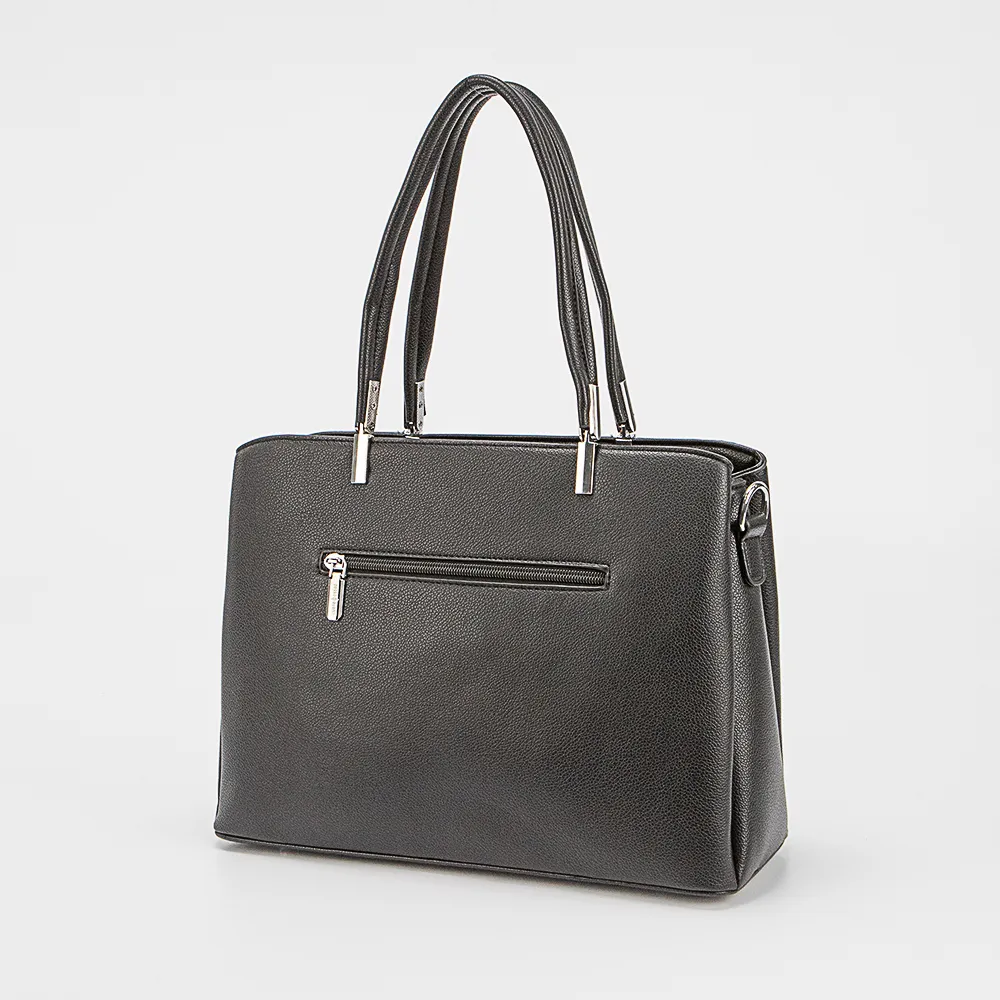 Сумка от торговой марки Passo Avanti из искусственной кожи черного цвета. Лицевая сторона декорирована вставками бордового цвета. Модель с двумя удлиненными ручками, съемным регулируемым плечевым ремнем. Закрывается молнией. Внутри: три отделения, с текстильной подкладкой; в среднем – карман на молнии, два накладных кармана. На задней стороне – карман на молнии. Дно оснащено металлическими ножками для защиты от износа.