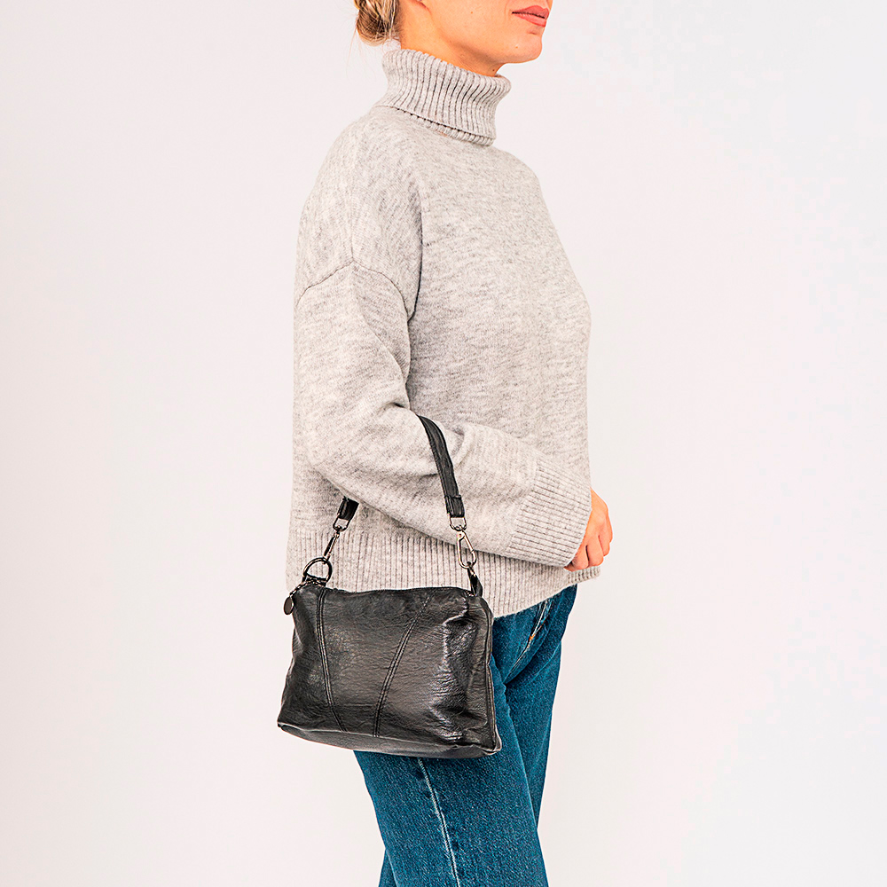Сумка от торговой марки Passo Avanti из искусственной кожи черного цвета. Модель со съемной ручкой и съемным регулируемым плечевым ремнем. Три отделения на молнии, с текстильной подкладкой; в среднем отделении – карман на молнии. На задней стороне – карман на молнии.