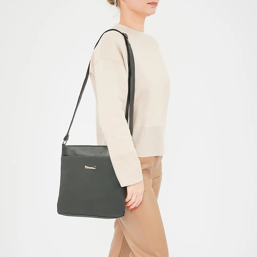 Сумка от торговой марки Passo Avanti из искусственной кожи и замши. Модель с несъемным регулируемым плечевым ремнем. Два отделения на молнии, с текстильной подкладкой; в одном из них – карман на молнии, в другом – накладной карман. На лицевой и задней стороне – карман на молнии.