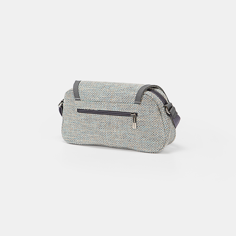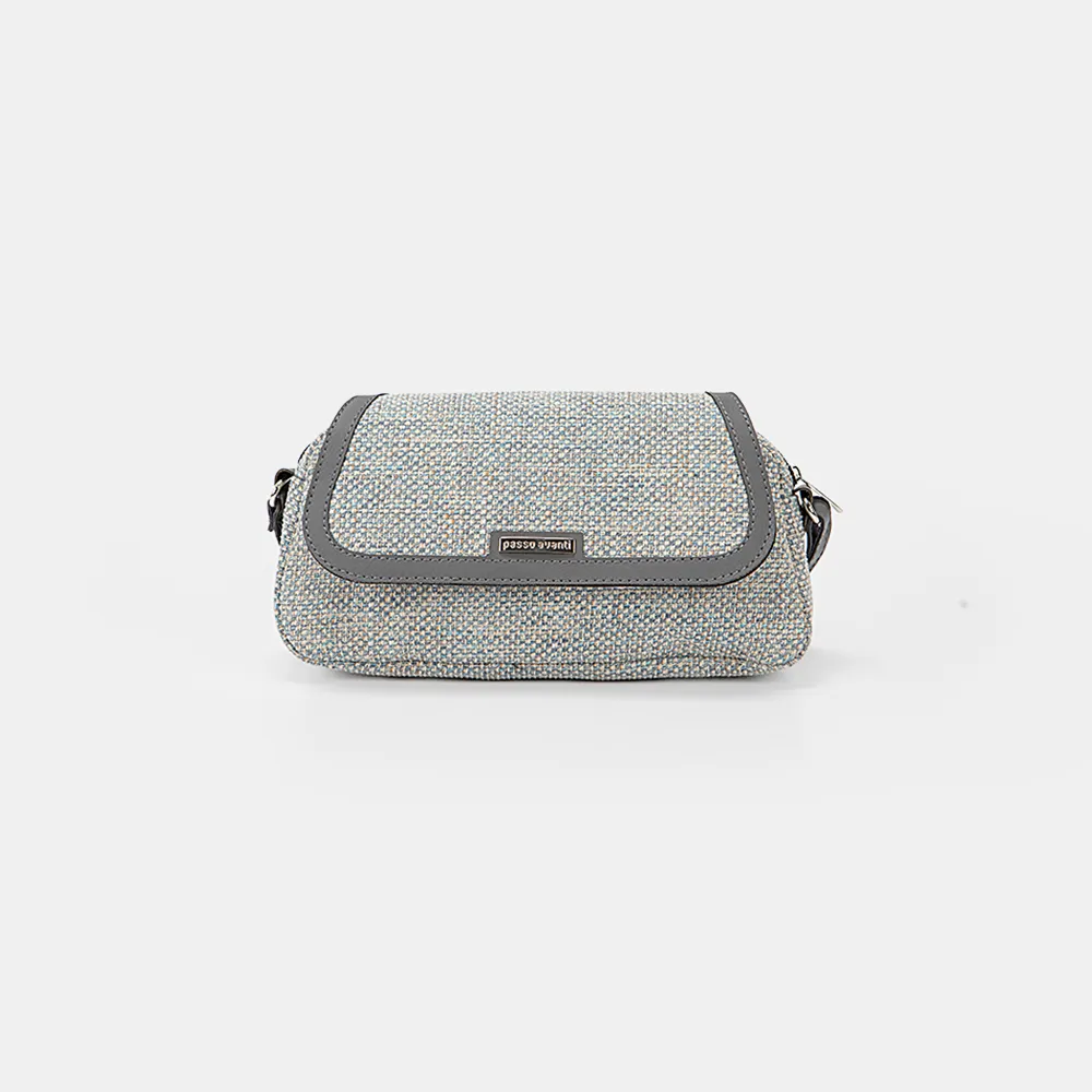 Сумка от торговой марки Passo Avanti из текстильного материала и искусственной кожи голубого цвета. Модель со съемным регулируемым плечевым ремнем. Клапан на магнитной кнопке закрывает карман на молнии и отделение на молнии. Внутри: текстильная подкладка, карман на молнии. На задней стороне – карман на молнии.