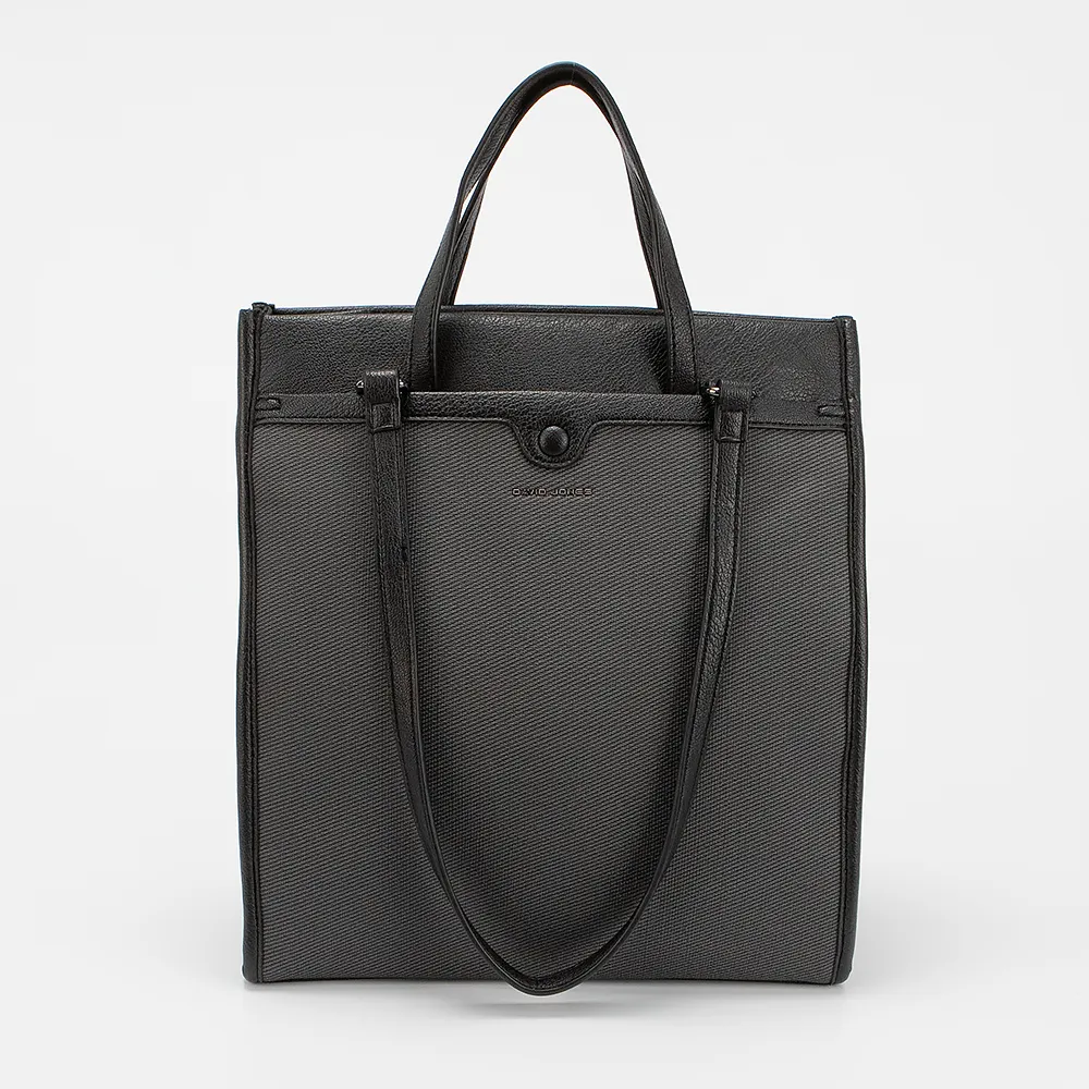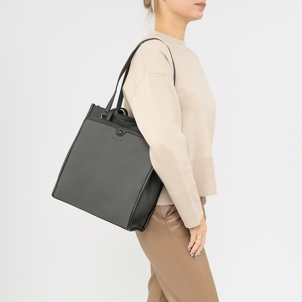 Сумка от торговой марки David Jones из искусственной кожи черного цвета. Модель вертикальной ориентации с двумя короткими и двумя удлиненными ручками. Отделение на молнии. Внутри: карман на молнии и накладной карман с хлястиком на кнопке. На лицевой и задней сторонах – вместительный накладной карман на магнитной кнопке. Дно оснащено металлическими ножками для защиты от износа.