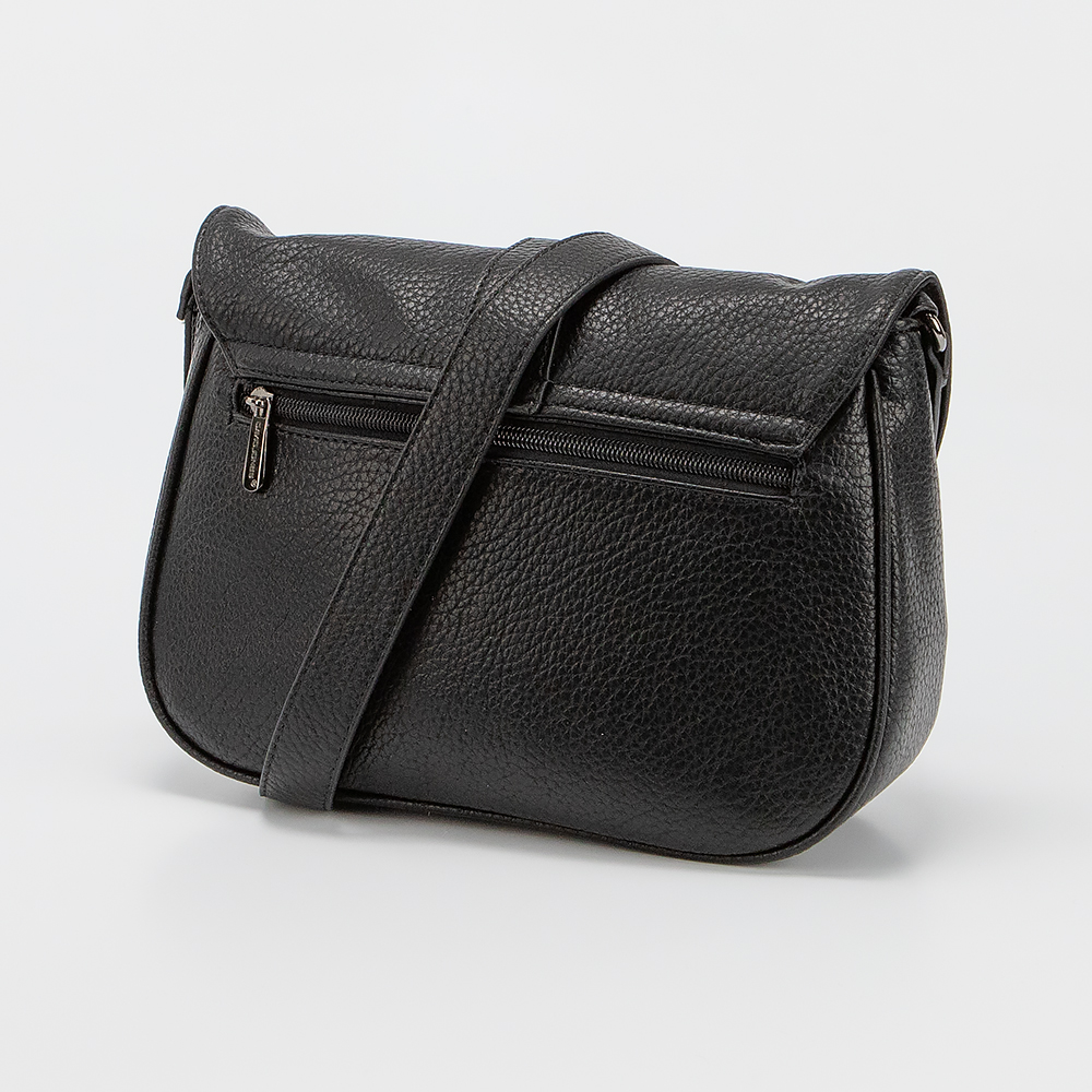Сумка от торговой марки David Jones из искусственной кожи черного цвета. Модель с несъемным регулируемым плечевым ремнем. Клапан на магнитной кнопке закрывает накладной карман и отделение на молнии. Внутри: фирменная подкладка, карман на молнии и накладной карман. На задней стороне – карман на молнии.