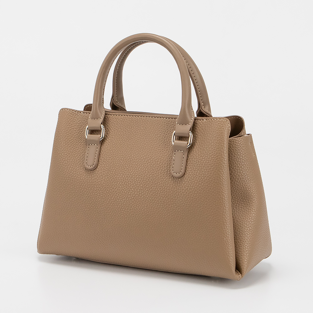 Сумка от торговой марки David Jones из искусственной кожи бежевого цвета. Модель с двумя плотными ручками и съемным регулируемым плечевым ремнем. Три отделения, с фирменной подкладкой. Крайние фиксируются магнитной кнопкой. Среднее отделение на молнии. Внутри: карман на молнии, накладной карман. На лицевой стороне – накладной карман. Дно оснащено металлическими ножками для защиты от износа.