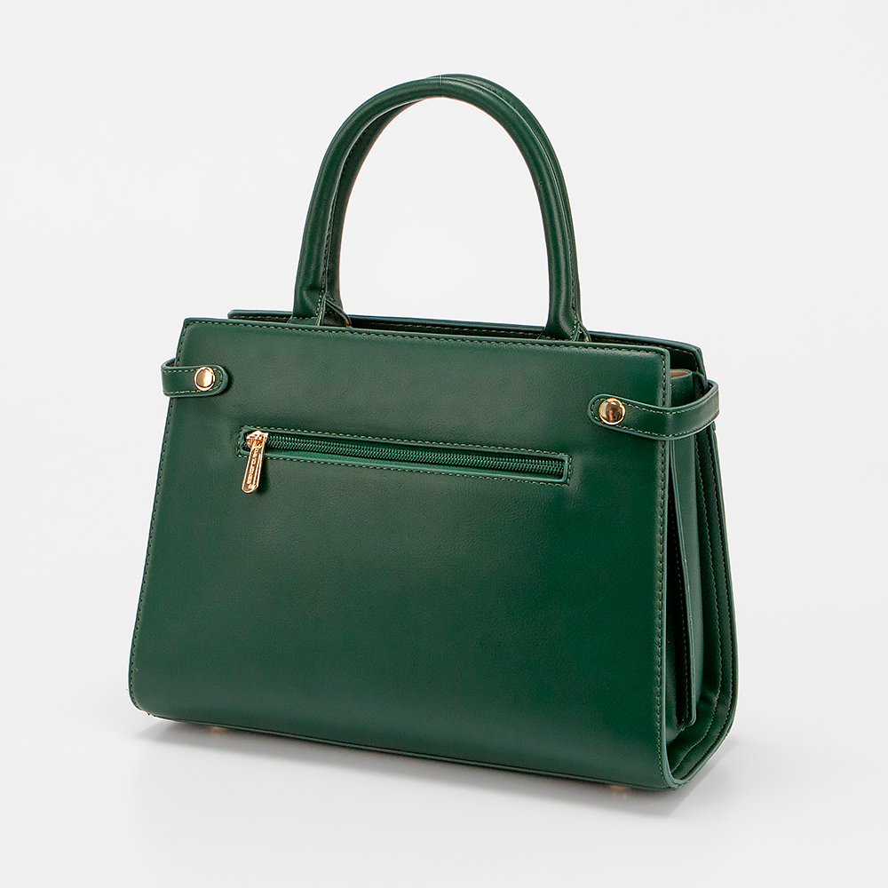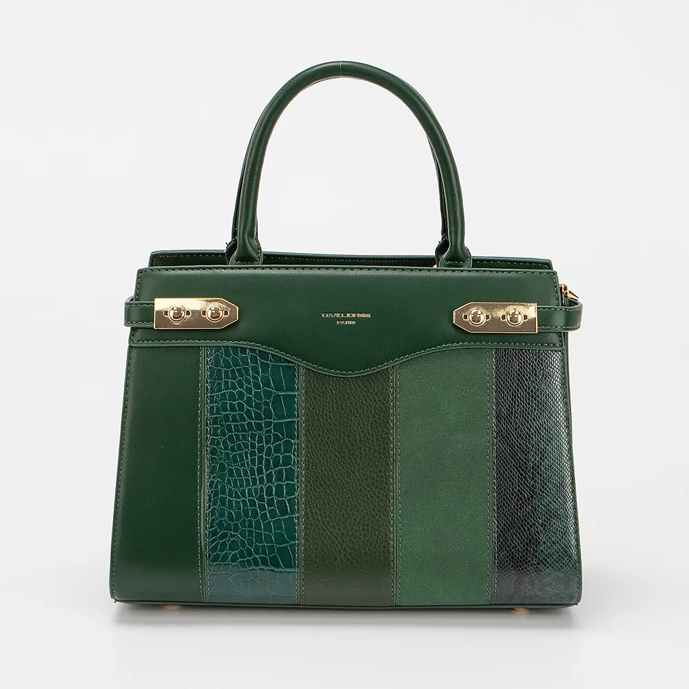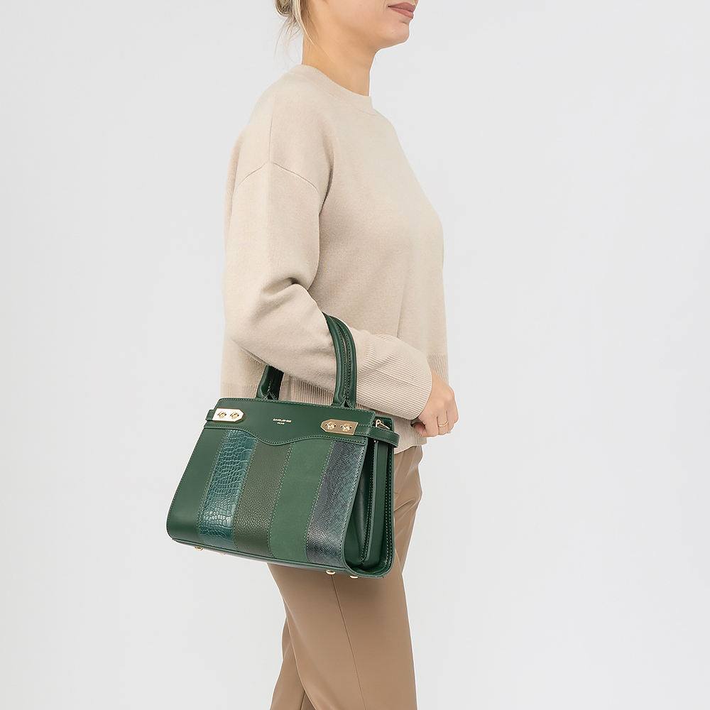 Сумка от торговой марки David Jones из искусственной кожи зеленого цвета. Лицевая сторона декорирована вставками с тиснением под рептилию и крокодила. Модель с двумя ручками, декорированными подвеской-цепочкой с мягким сердечком, и съемным регулируемым плечевым ремнем. Отделение на молнии. Внутри: фирменная подкладка, карман на молнии, накладной карман. На задней стороне – карман на молнии. Дно оснащено металлическими ножками для защиты от износа.