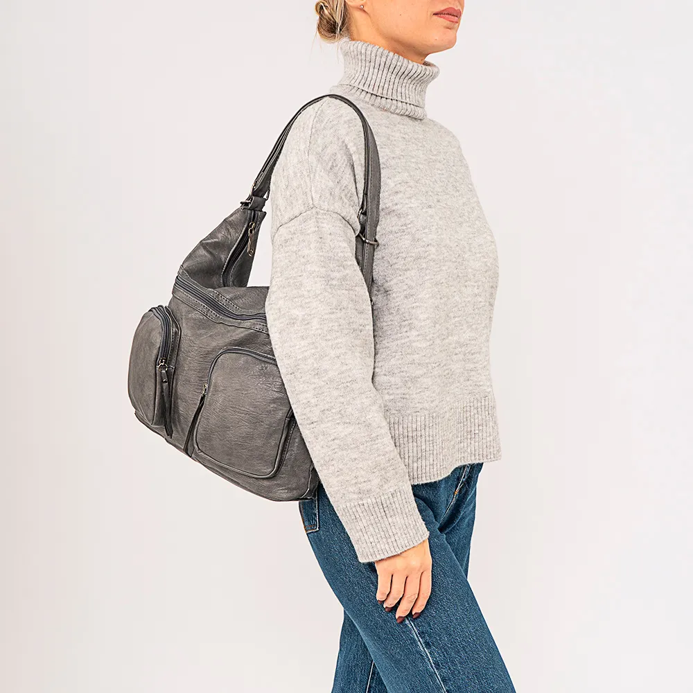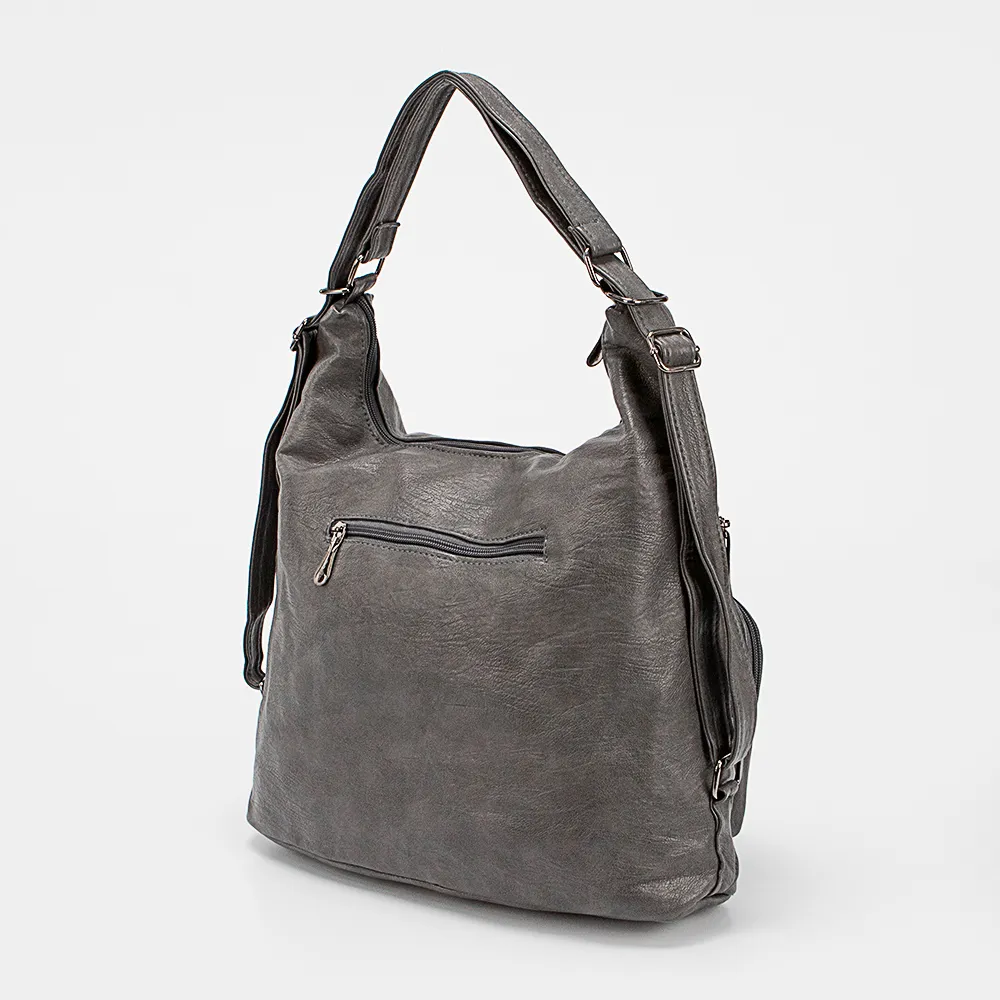 Сумка-рюкзак от торговой марки Passo Avanti из искусственной кожи серого цвета. Модель с двумя ручками, которые стягиваются в плечевые лямки. Отделение на молнии. Внутри: текстильная подкладка, средник и кармана на молнии, два накладных кармана. На лицевой стороне – три кармана на молнии. На задней стороне – карман на молнии.