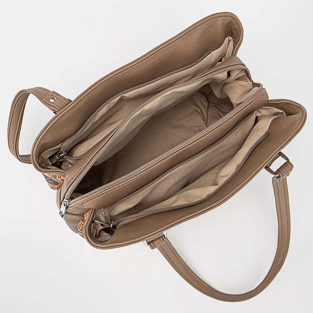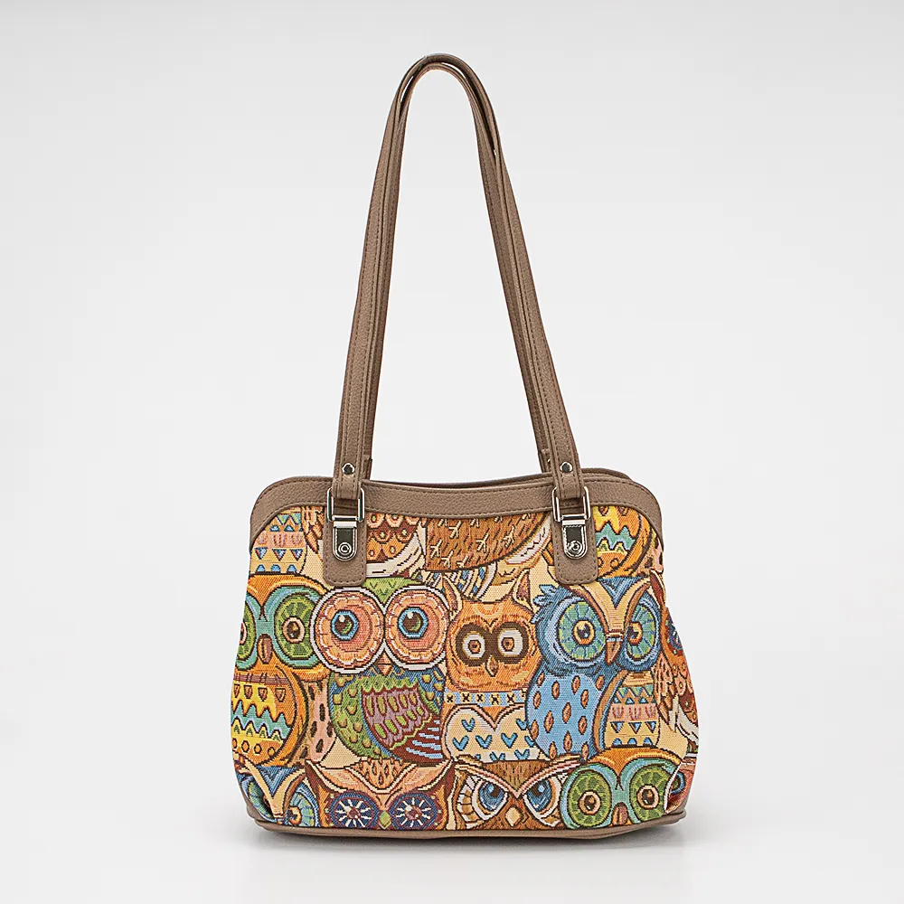Сумка от торговой марки Passo Avanti из искусственной кожи и гобеленовой ткани и оригинальным рисунком с изображением сов. Модель с двумя удлиненными ручками. Три отделения на молнии. Внутри: текстильная подкладка; в среднем отделении – карман на молнии. На задней стороне – карман на молнии.