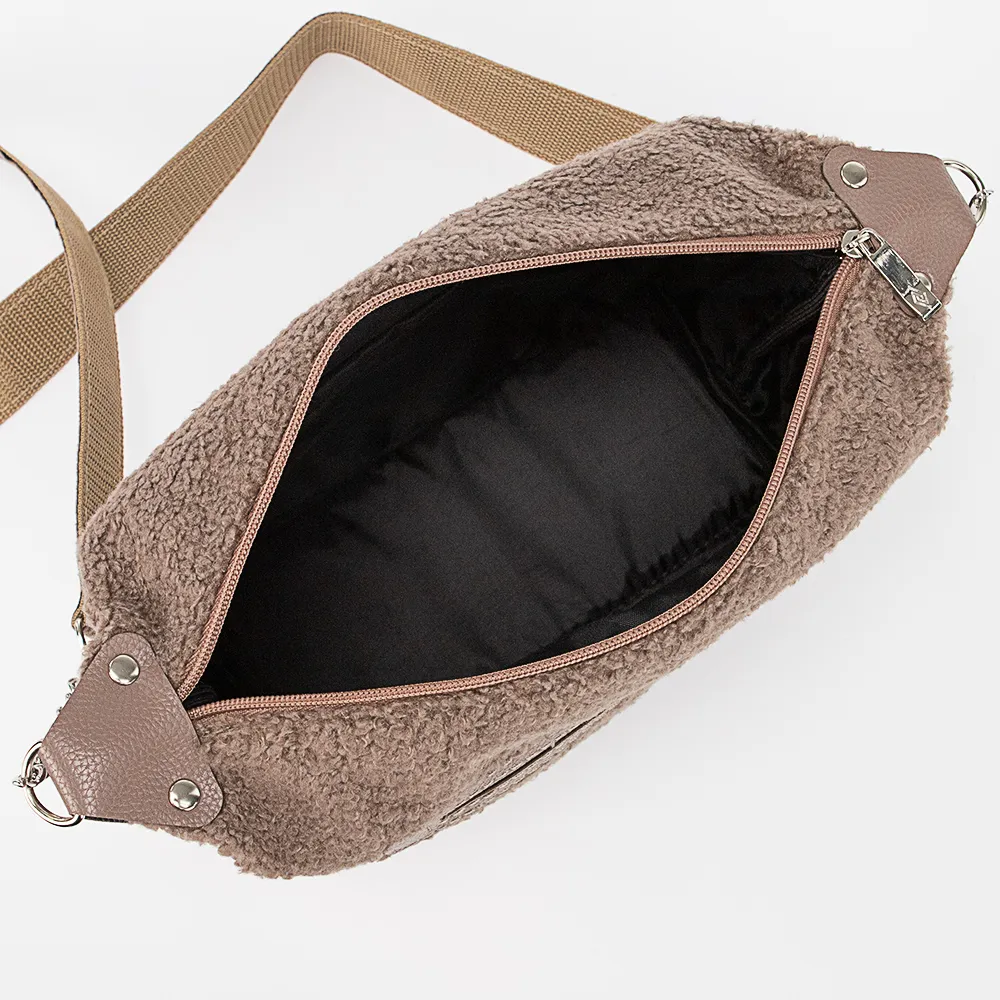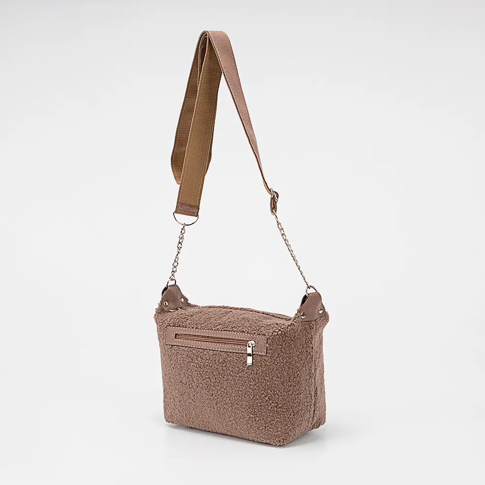 Сумка от торговой марки Passo Avanti из искусственного меха и искусственной кожи кофейного. Модель с несъемным регулируемым плечевым ремнем-цепочкой. Отделение на молнии, с текстильной подкладкой и карманами. На задней стороне – карман на молнии. Дно оснащено пластиковыми ножками для защиты от износа. В комплекте имеется кошелек из искусственного меха с отделением на молнии.