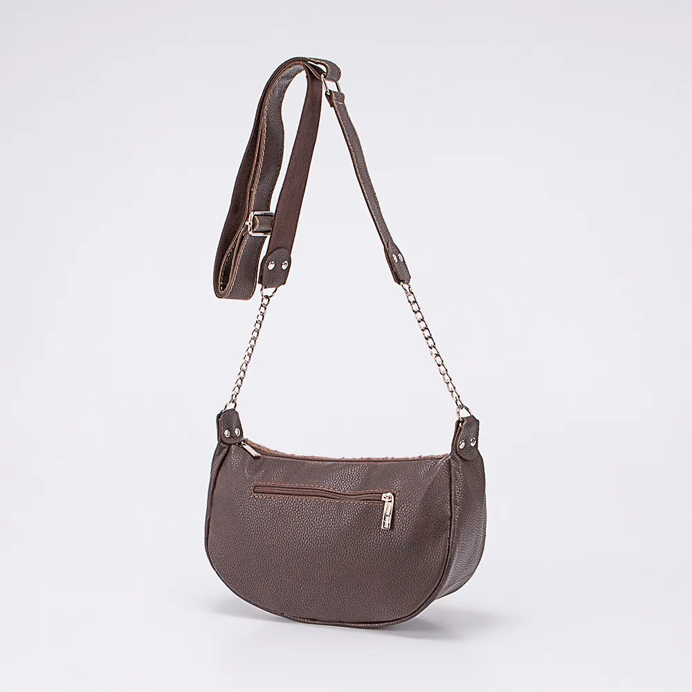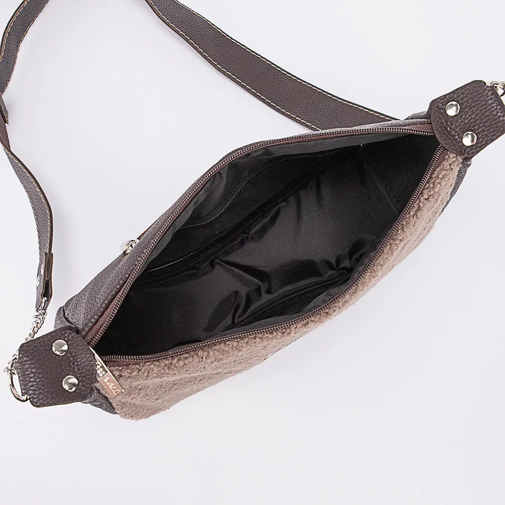 Сумка от торговой марки Passo Avanti из искусственного меха и искусственной кожи в сочетании кофейного и коричневого цвета. Модель с несъемным регулируемым плечевым ремнем-цепочкой. Отделение на молнии. Внутри: текстильная подкладка, карман на молнии, накладной карман. На задней стороне – карман на молнии.