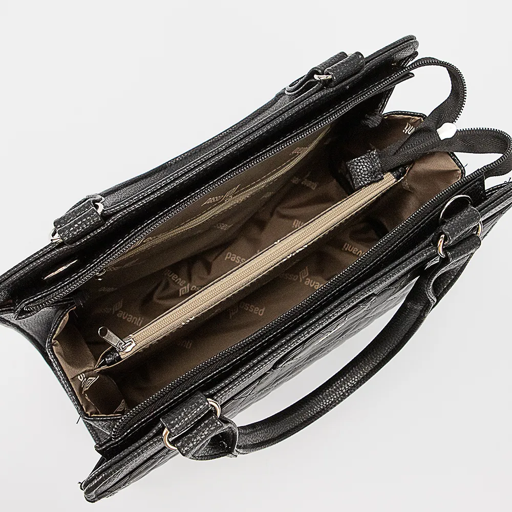 Сумка от торговой марки Passo Avanti из искусственной кожи черного цвета. Декорирована ромбовидной стежкой. Модель с двумя ручками на кольцах и съемным плечевым ремнем. Отделение на молнии. Внутри: текстильная подкладка, средник и карман на молнии. На задней стороне – карман на молнии.