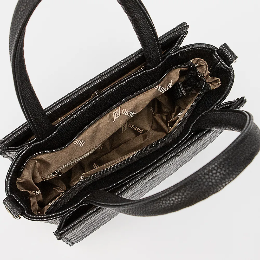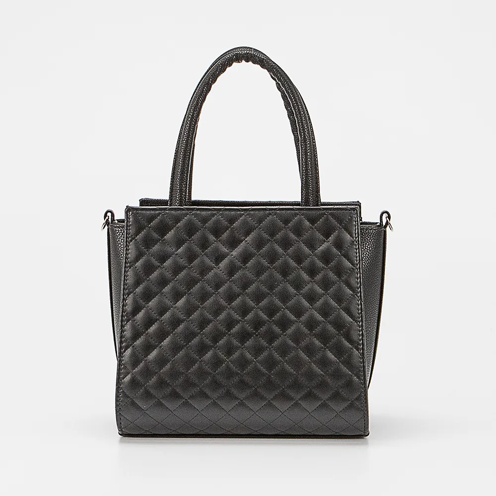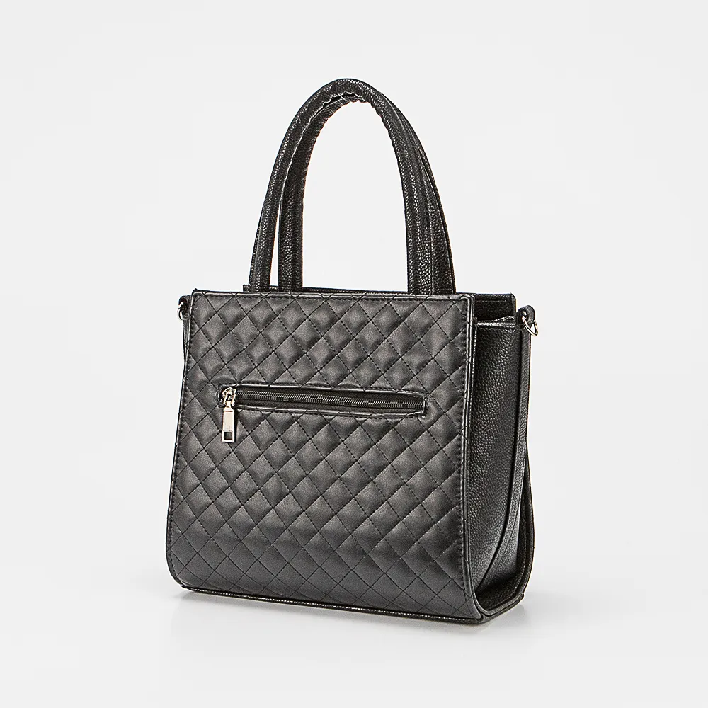 Сумка от торговой марки Passo Avanti из искусственной кожи черного цвета. Декорирована ромбовидной стежкой. Модель с двумя удлиненными ручками и съемным плечевым ремнем. Три отделения на молнии, с текстильной подкладкой. Крайние фиксируются магнитной кнопкой. Среднее отделение на молнии; внутри: текстильная подкладка, карман на молнии, два накладных кармана. На задней стороне – карман на молнии.