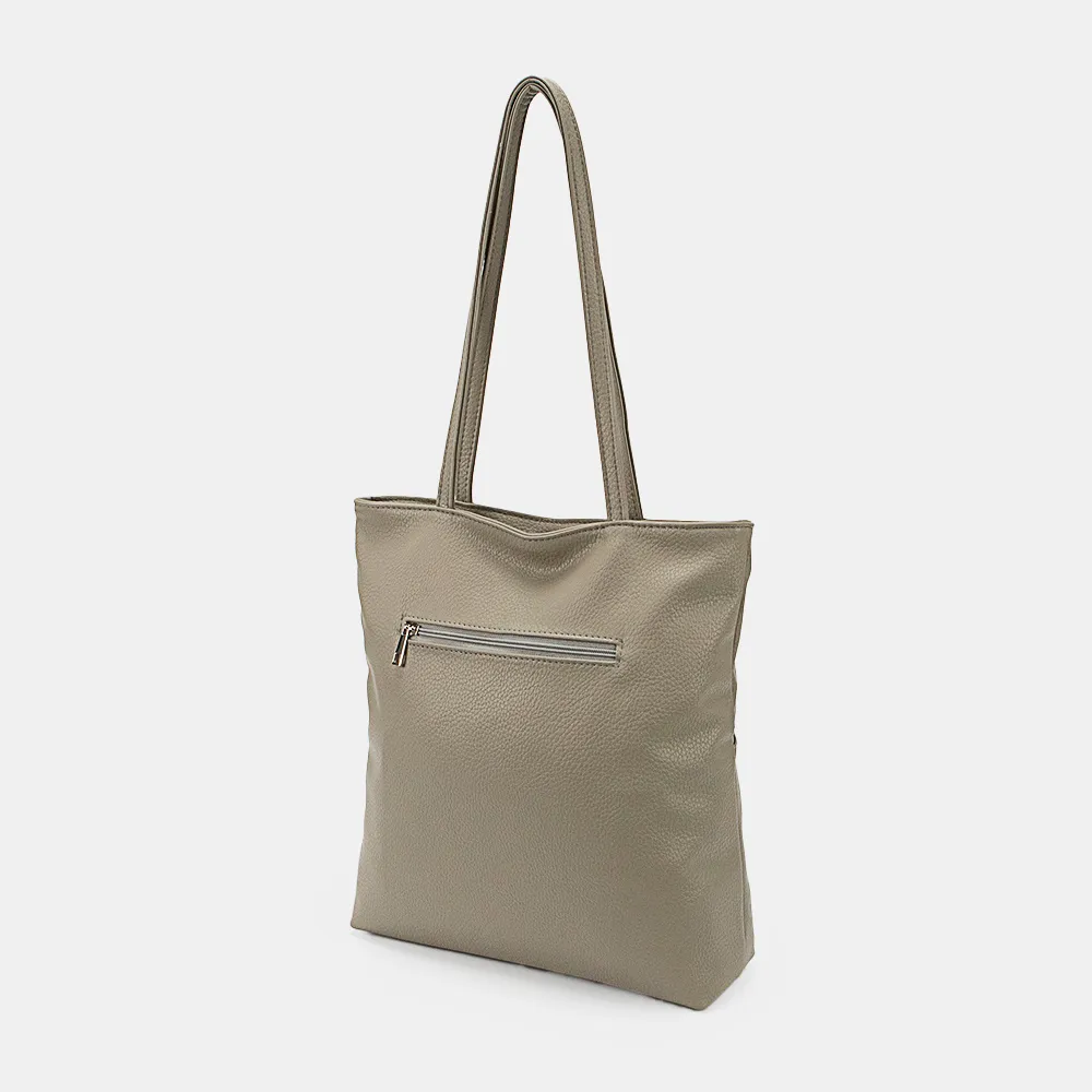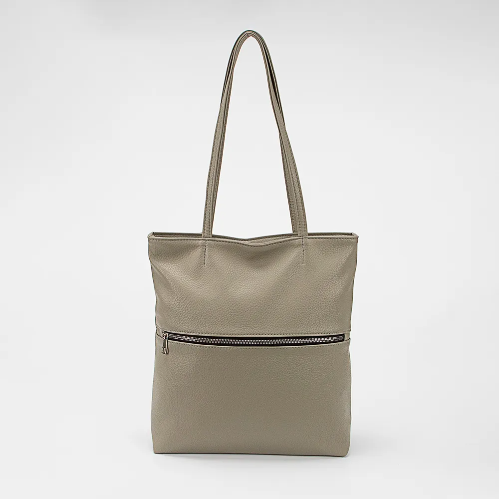 Сумка от торговой марки Passo Avanti из искусственной кожи серого цвета. Модель вертикальной ориентации, с двумя удлиненными тонкими ручками. Глубокое отделение на молнии. Внутри: текстильная подкладка, карман на молнии, два накладных кармана. На задней стороне – карман на молнии.
