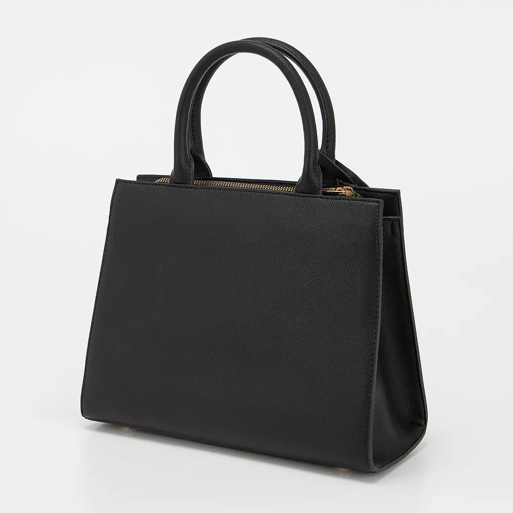 Сумка от торговой марки David Jones из искусственной кожи черного цвета. Декорирована ремешком с позолоченной пряжкой и подвеской из искусственной кожи. Модель с двумя ручками и съемным регулируемым плечевым ремнем. Отделение на молнии. Внутри: фирменная подкладка, карман на молнии, накладной карман. Дно оснащено металлическими ножками для защиты от износа