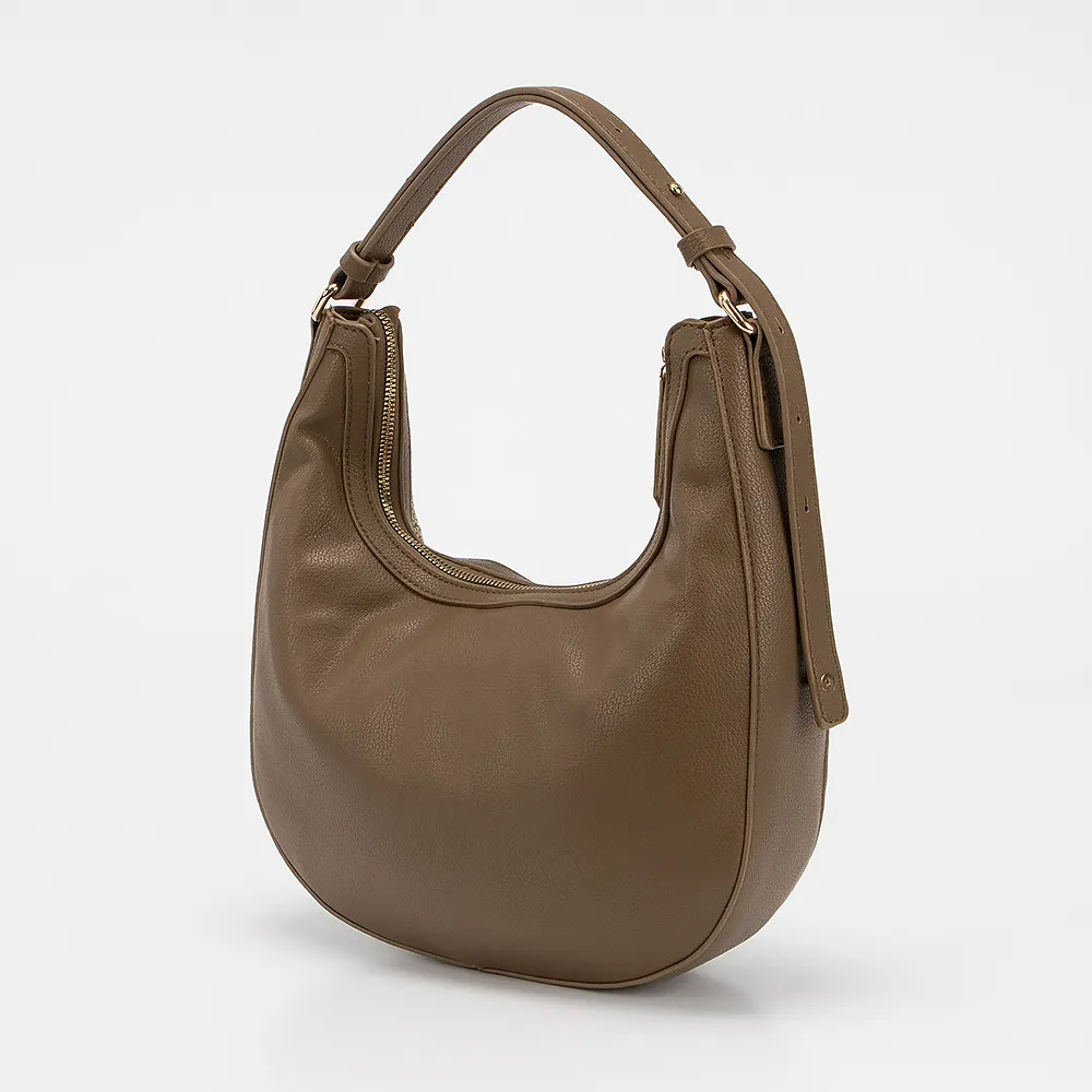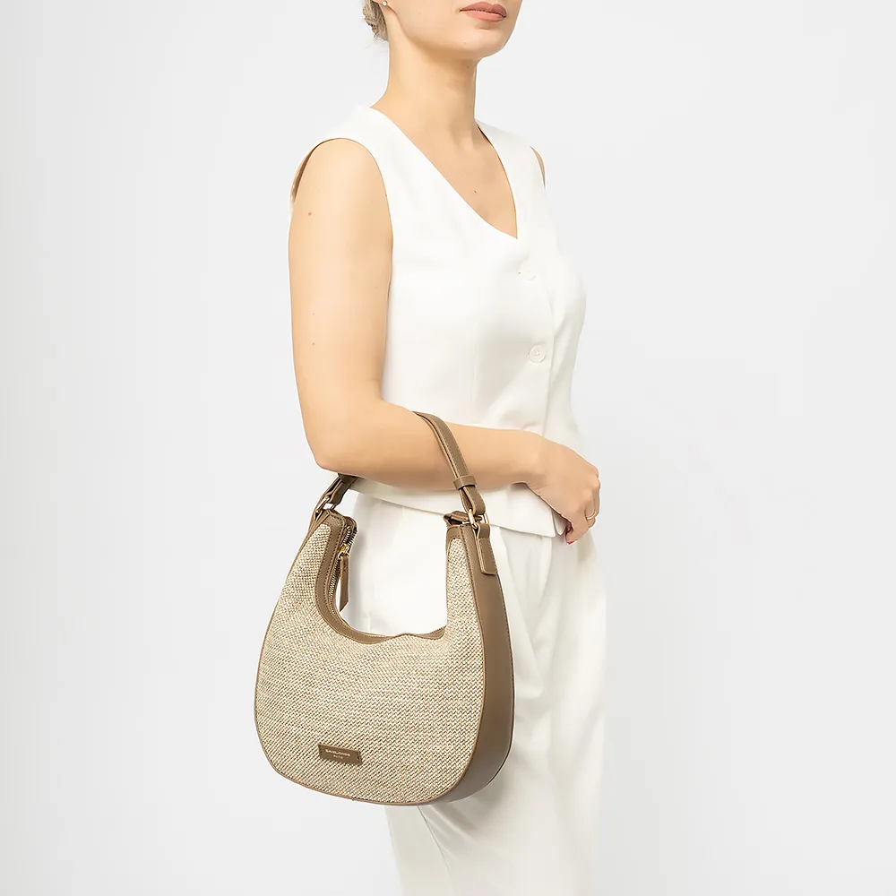 Сумка от торговой марки David Jones из искусственной кожи и текстильного материала бежевого цвета. Модель с длинной регулируемой ручкой. Отделение на молнии. Внутри: фирменная подкладка, накладной карман, карман на молнии.