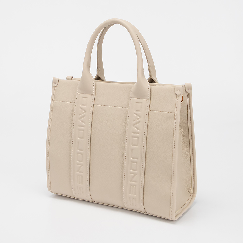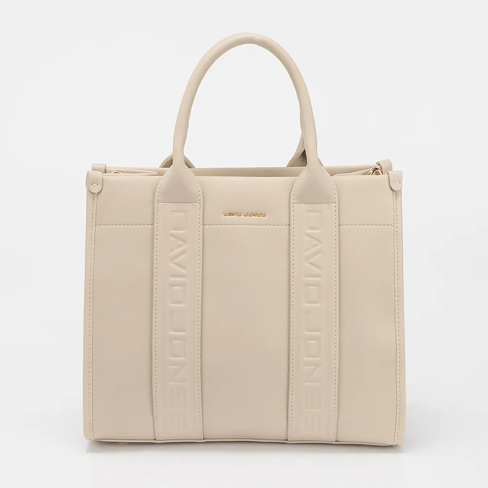 Сумка от торговой марки David Jones из искусственной кожи светло-бежевого цвета. Модель с двумя ручками и съемным регулируемым плечевым ремнем. Отделение на молнии. Внутри: фирменная подкладка, карман на молнии, накладной карман. Дно оснащено металлическими ножками для защиты от износа.