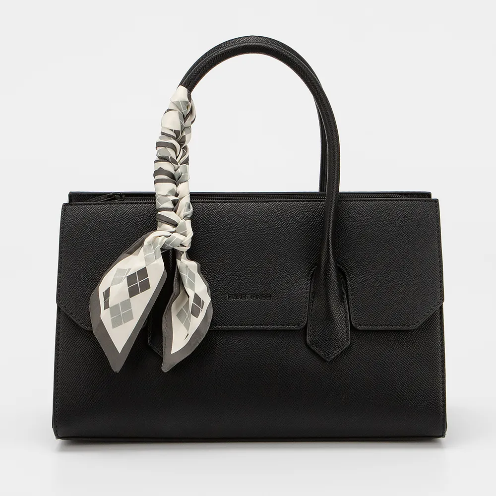 Сумка от торговой марки David Jones из искусственной кожи черного цвета. Модель с двумя ручками и съемным регулируемым плечевым ремнем. Декорирована платком твилли. Отделение на молнии. Внутри: фирменная подкладка, накладной карман, карман на молнии.