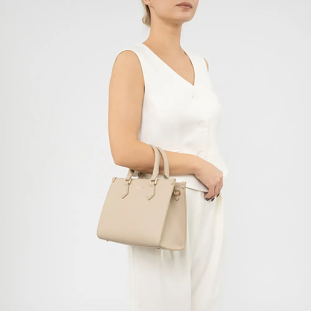 Сумка от торговой марки David Jones из искусственной кожи бежевого цвета. Модель с двумя ручками и съемным регулируемым плечевым ремнем. Отделение на молнии. Внутри: фирменная подкладка, карман на молнии и накладной карман. Спереди и сзади карман на магнитной кнопке. Дно оснащено металлическими ножками для защиты от износа.