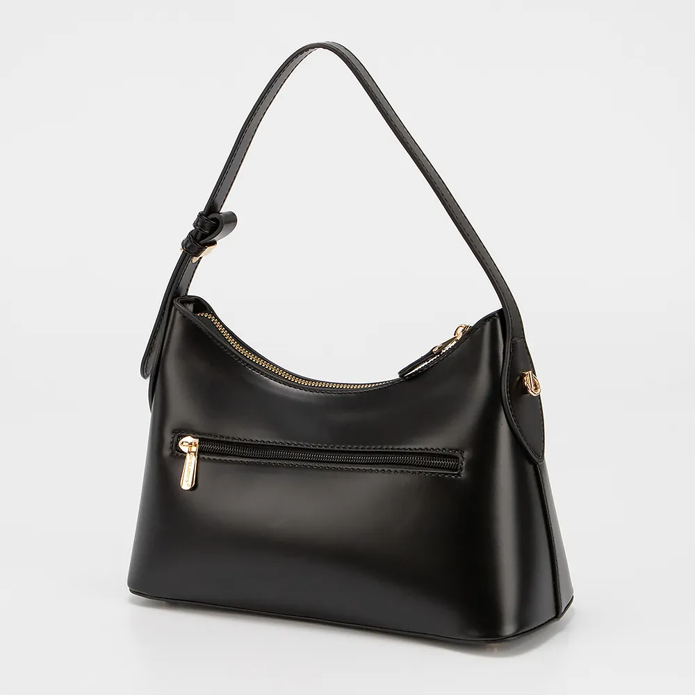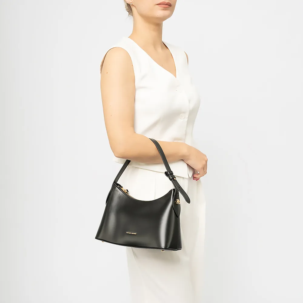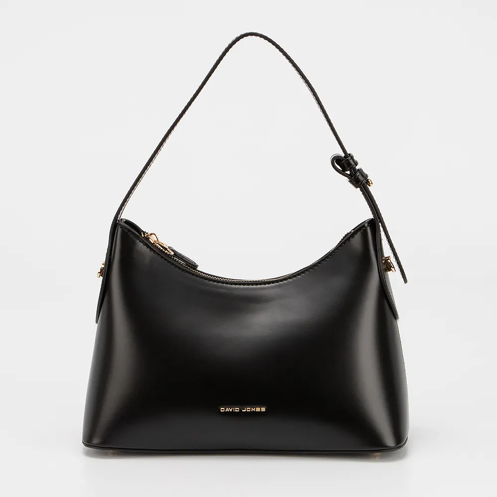 Сумка от торговой марки David Jones из искусственной кожи черного цвета. Модель с длинной ручкой и съемным регулируемым плечевым ремнем. Отделение на молнии. Внутри: фирменная подкладка, накладной карман, карман на молнии. На задней стороне - карман на молнии. Дно оснащено металлическими ножками для защиты от износа.