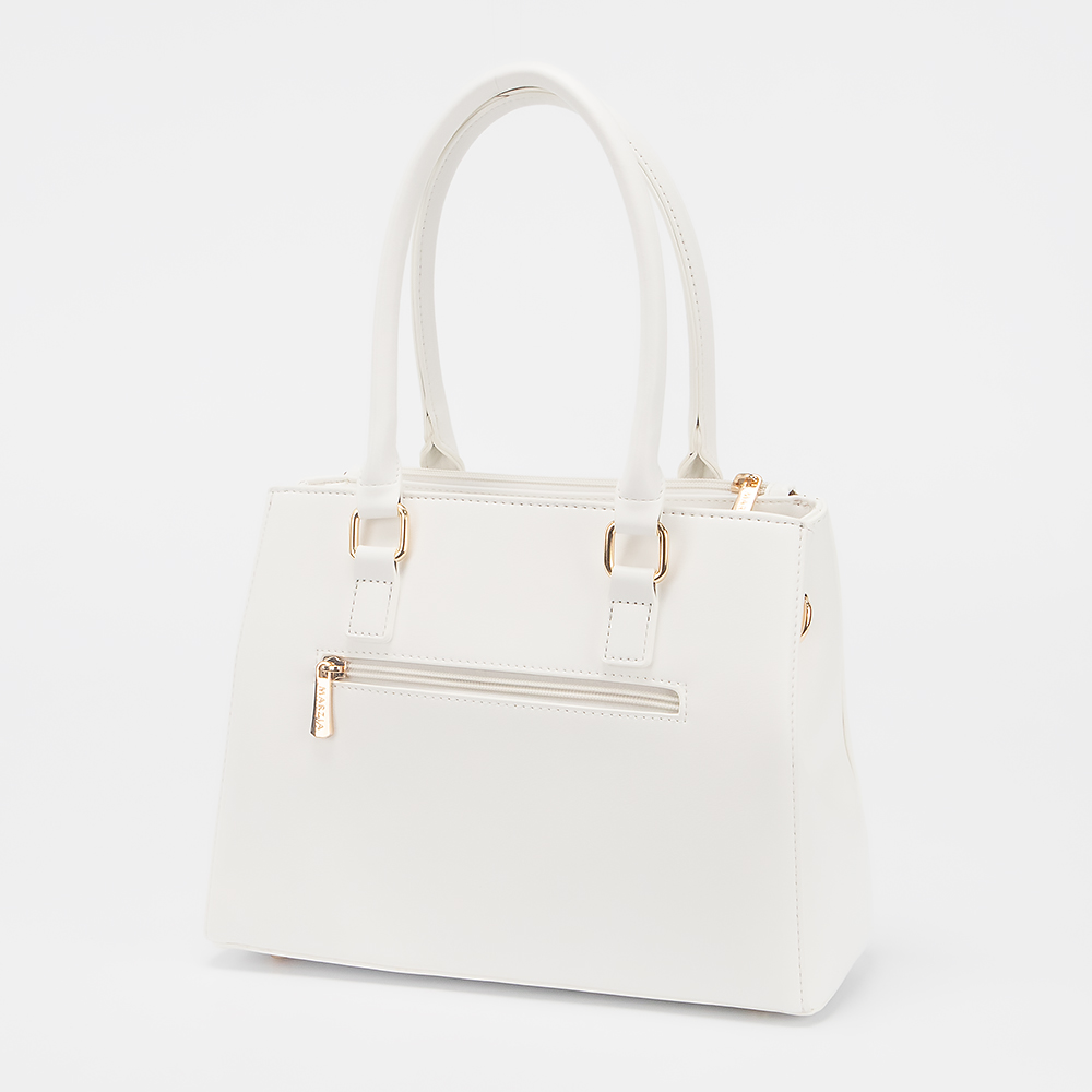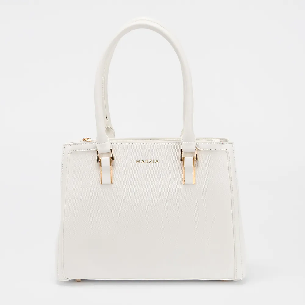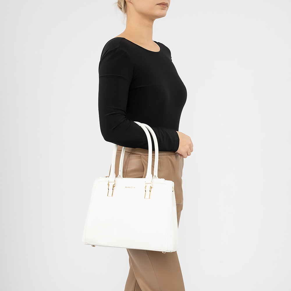 Сумка от торговой марки Marzia из искусственной кожи белого цвета. Модель с двумя ручками и съемным регулируемым плечевым ремнем. Закрывается молнией. Внутри: два отделения с фирменной подкладкой, карман на молнии, накладной карман. На задней стороне - карман на молнии. Дно оснащено металлическими ножками для защиты от износа.