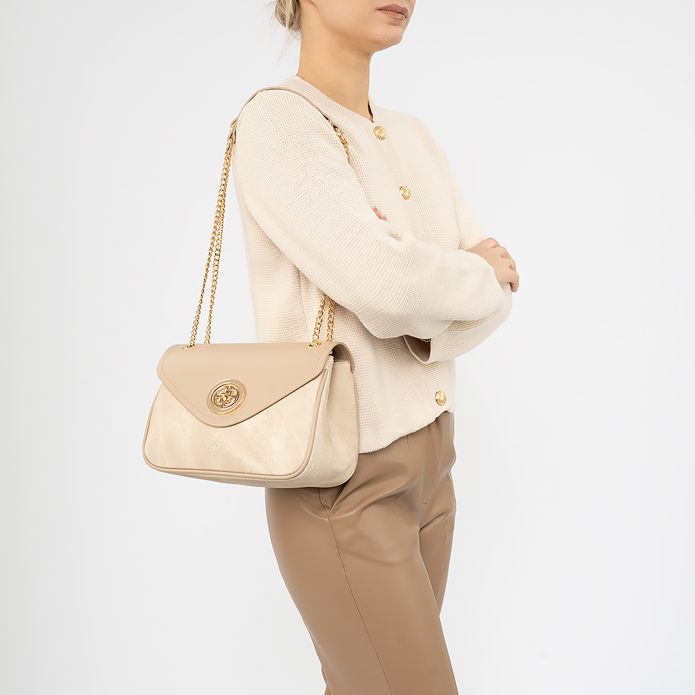 Сумка от торговой марки Marzia из искусственной кожи бежевого цвета. Модель с двумя ручками-цепочками. Закрывается клапаном на поворотном замке. В отделении: текстильная подкладка, карман на молнии, накладной карман, средник на молнии.