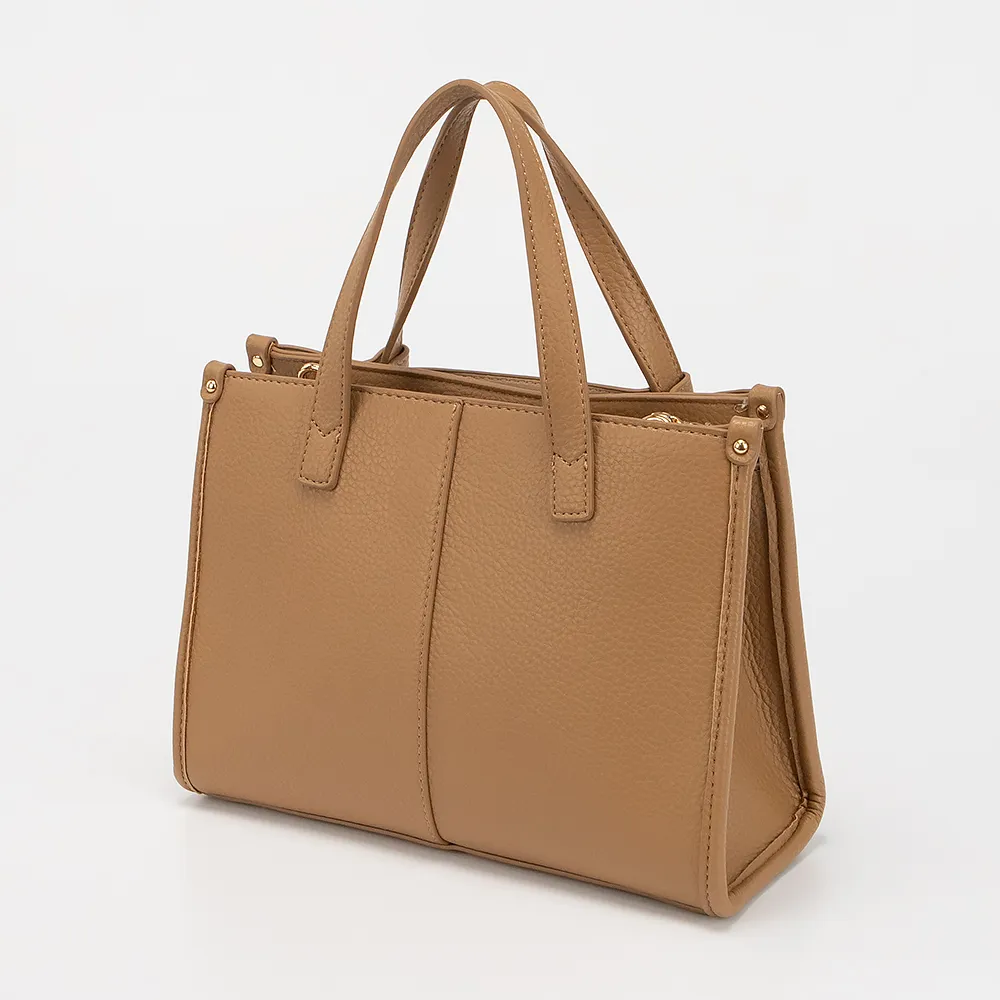 Сумка от торговой марки Passo Avanti из искусственной кожи коричневого цвета. Модель с двумя ручками и съемным регулируемым плечевым ремнем. Основное отделение на молнии. Внутри: текстильная подкладка, карман на молнии, накладной карман. Предусмотрено дополнителоьное отделение на поворотном замке. Дно оснащено металлическими ножками для защиты от износа.