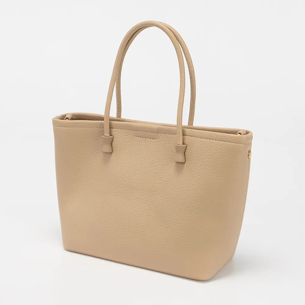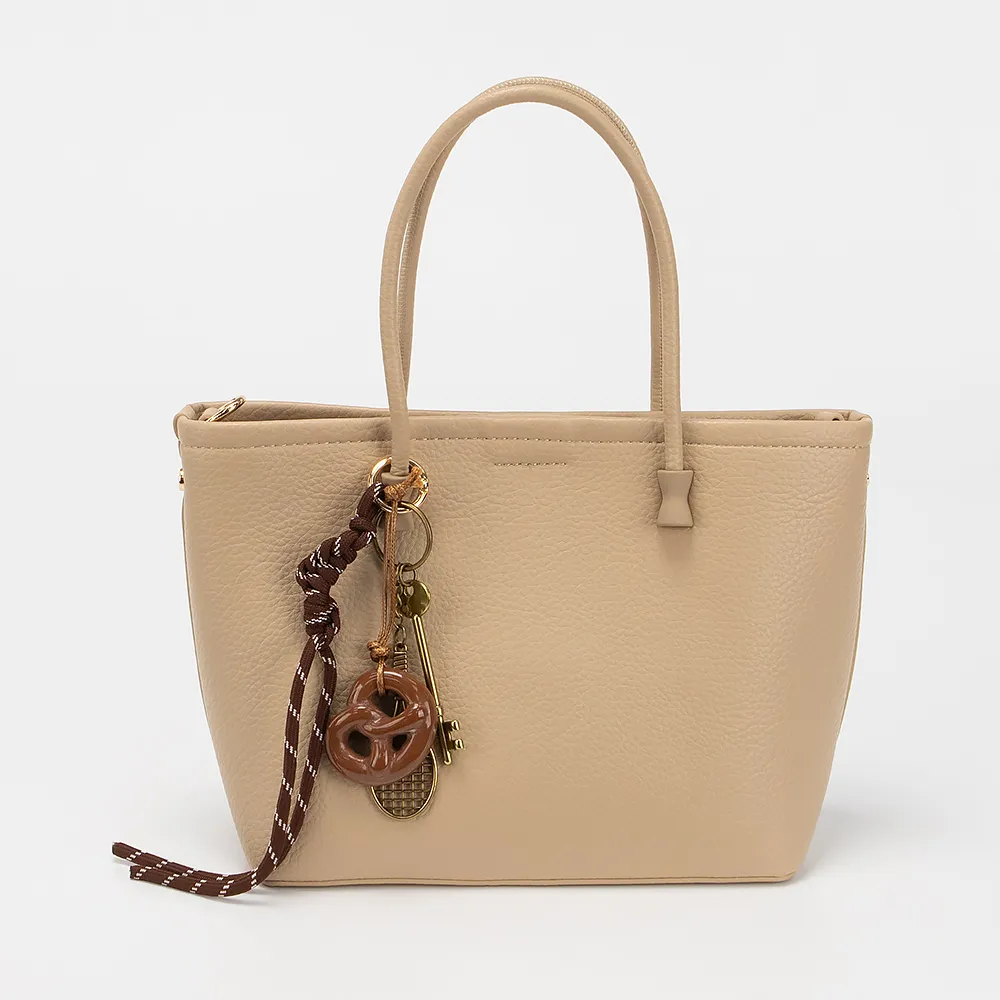 Сумка от торговой марки Passo Avanti из искусственной кожи бежевого цвета. Модель с двумя ручками и съемным регулируемым плечевым ремнем. Декорирована подвеской в виде шнурка, ключа, кренделя и теннисной ракетки.Отделение на молнии и магнитной кнопке. Внутри: фирменная подкладка, накладной карман и карман на молнии.