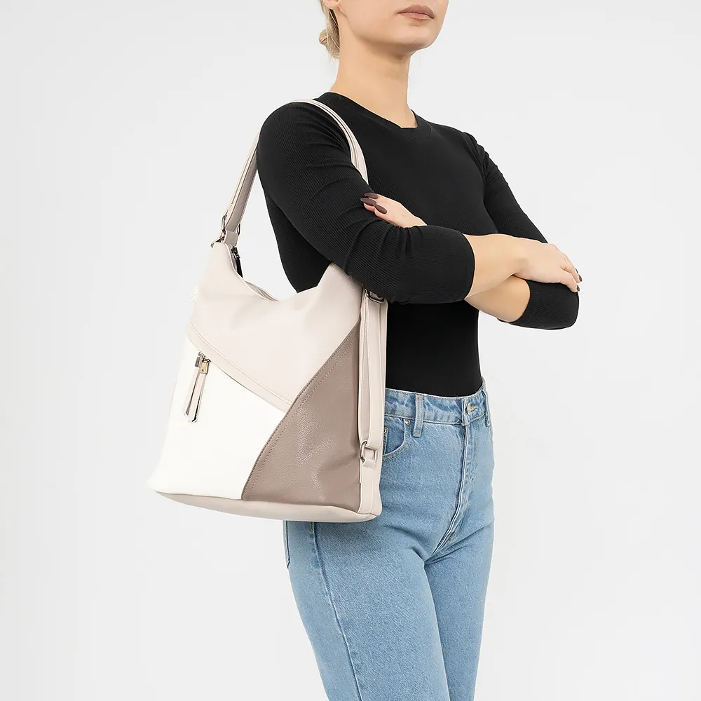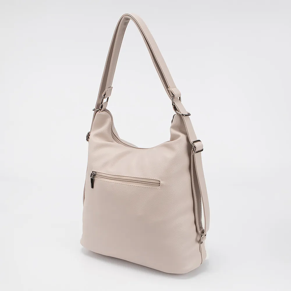 Сумка-рюкзак от торговой марки Passo Avanti из искусственной кожи. Лицевая сторона декорирована вставками. Модель с двумя удлиненными ручками, которые стягиваются в плечевые лямки. Отделение на молнии. Внутри: текстильная подкладка, средник и карман на молнии, два накладных кармана. На лицевой стороне - карман на молнии. На задней стороне - карман на молнии.