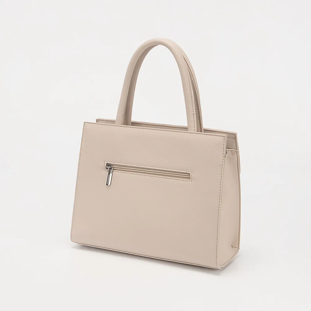 Сумка от торговой марки Passo Avanti из искусственной кожи бежевого цвета. Модель с двумя длинными ручками и съемным регулируемым плечевым ремнем. Отделение на молнии. Внутри текстильная подкладка, карман и средник на молнии, накладной карман. Сзади - карман на молнии.