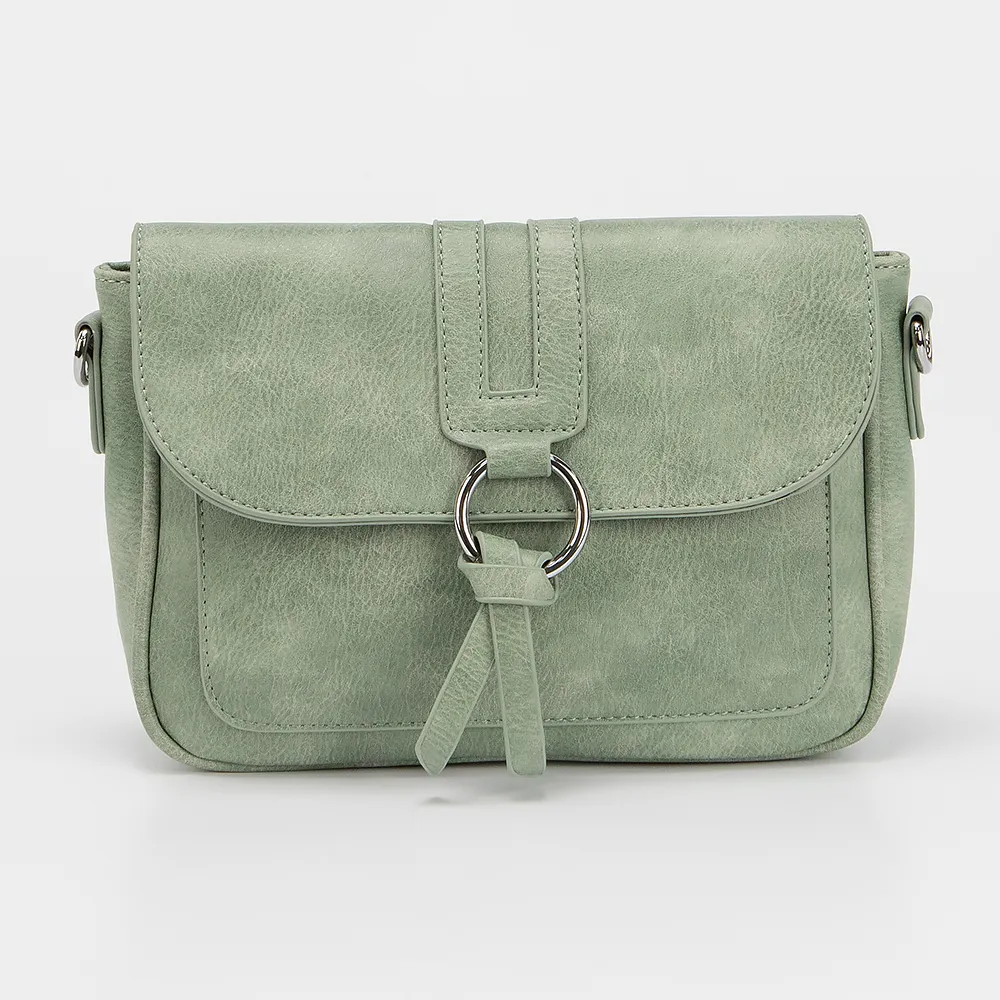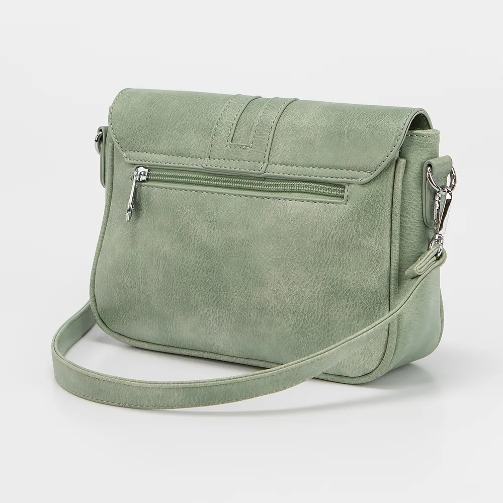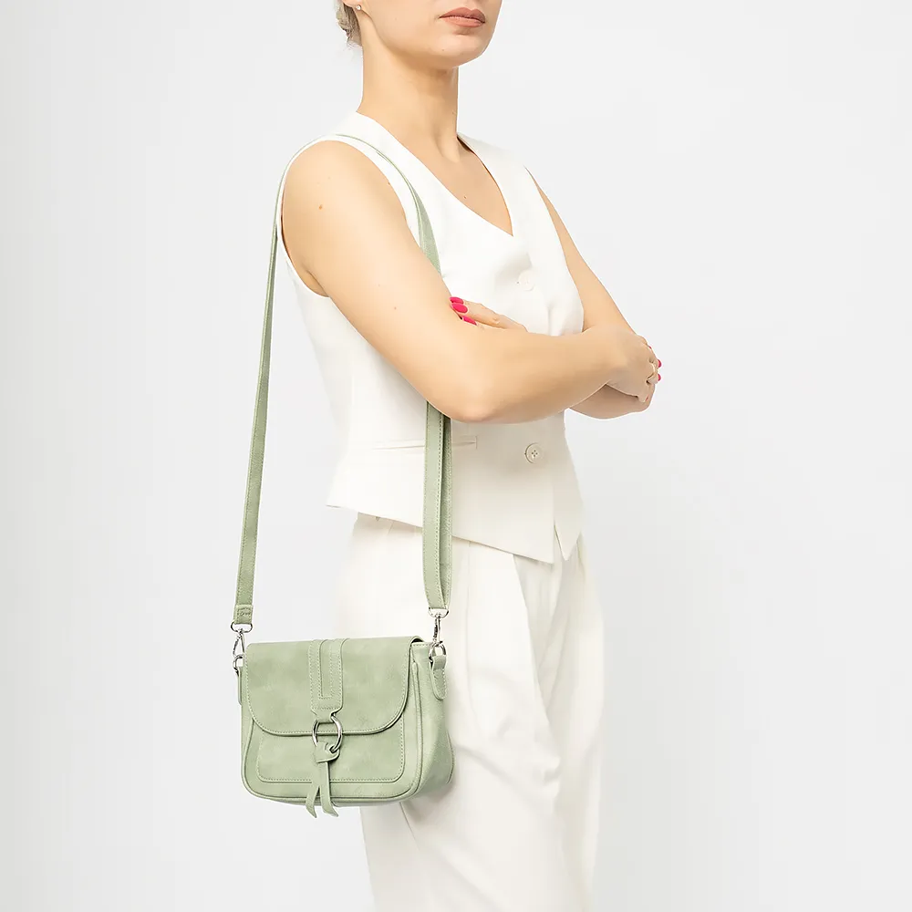 Сумка от торговой марки Passo Avanti из искусственной кожи зеленого цвета. Модель со съемным регулируемым плечевым ремнем. Клапан на магнитной кнопке закрывает накладной карман и отделение на молнии. Внутри: текстильная подкладка, карман на молнии, накладной карман. На задней стороне - карман на молнии.