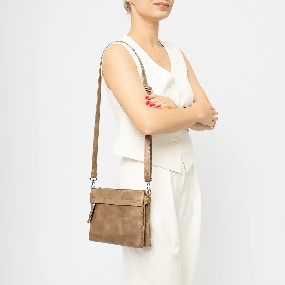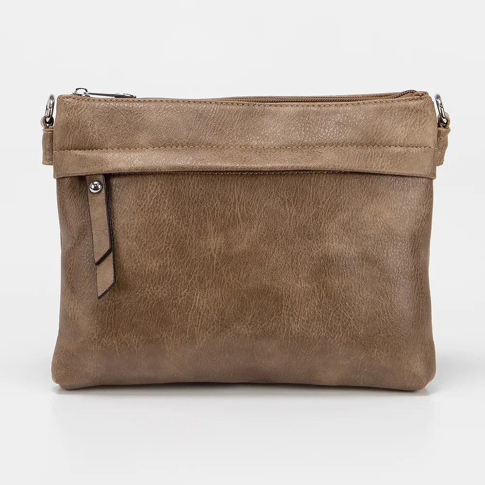 Сумка от торговой марки Passo Avanti из искусственной кожи кофейного цвета. Модель со съемным регулируемым плечевым ремнем. Закрывается молнией. Внутри: текстильная подкладка, три отсека, в одном из них - карман на молнии, в другом - накладной карман. На лицевой и задней сторонах - карман на молнии.