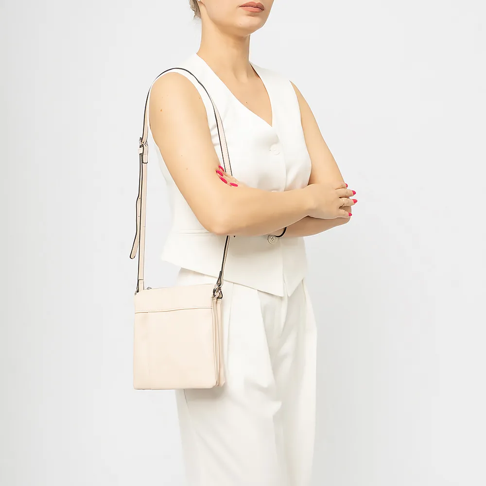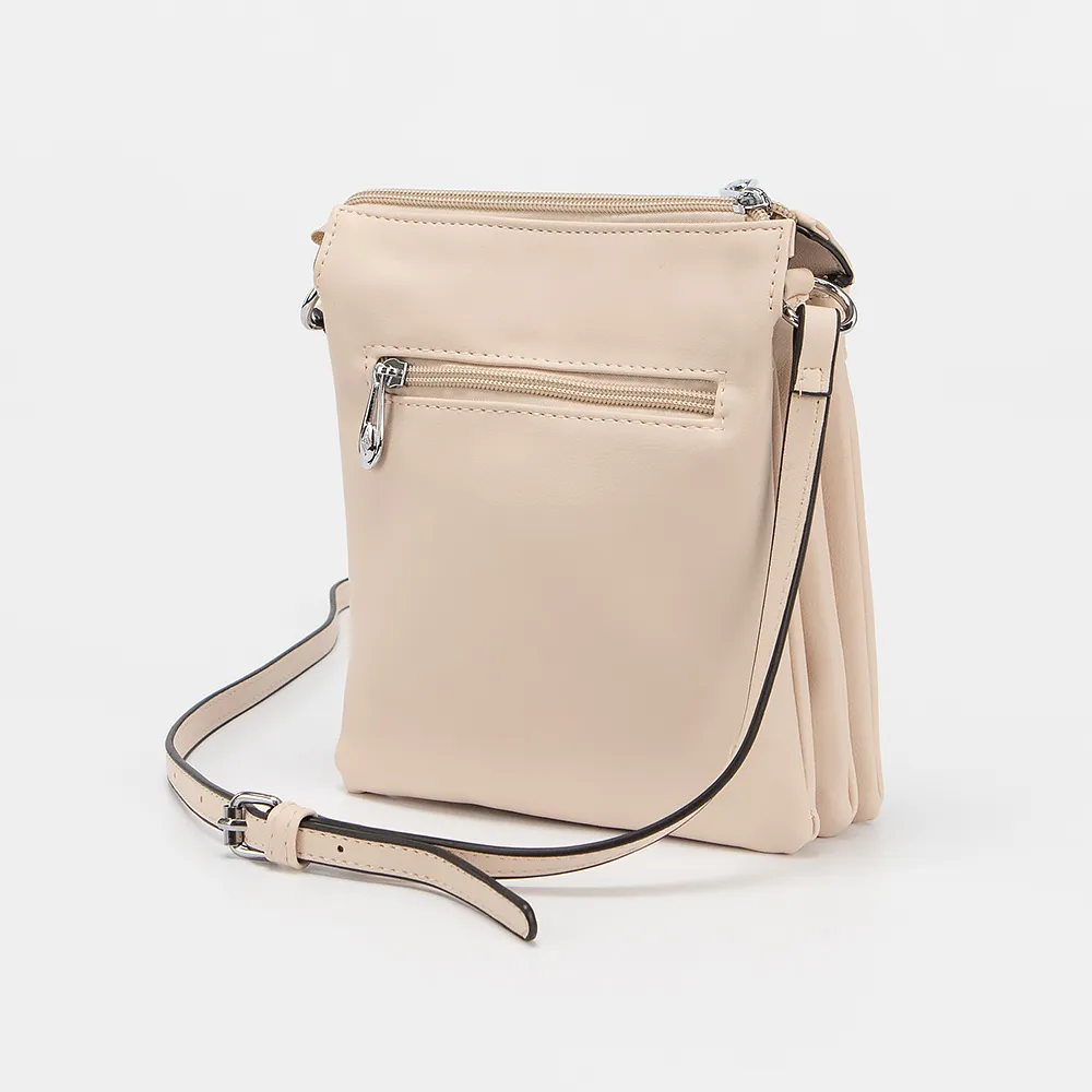 Сумка-планшет от торговой марки Passo Avanti из искусственной кожи бежевого цвета. Модель с длинным регулируемым плечевым ремнем. Закрывается молнией. Внутри: три отсека, текстильная подкладка, карман на молнии и накладной карман. На лицевой и задней стороне - карман на молнии.