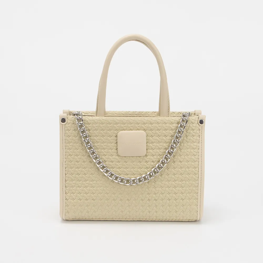 Сумка от торговой марки Passo Avanti из искусственной кожи светло-бежевого цвета. Модель с длинными ручками и съемным регулируемым плечевым ремнем. Декорирована тиснением и съемной цепочкой. Отделение на молнии, внутри текстильная подкладка, карман на молнии, накладной карман. Сзади карман на молнии.