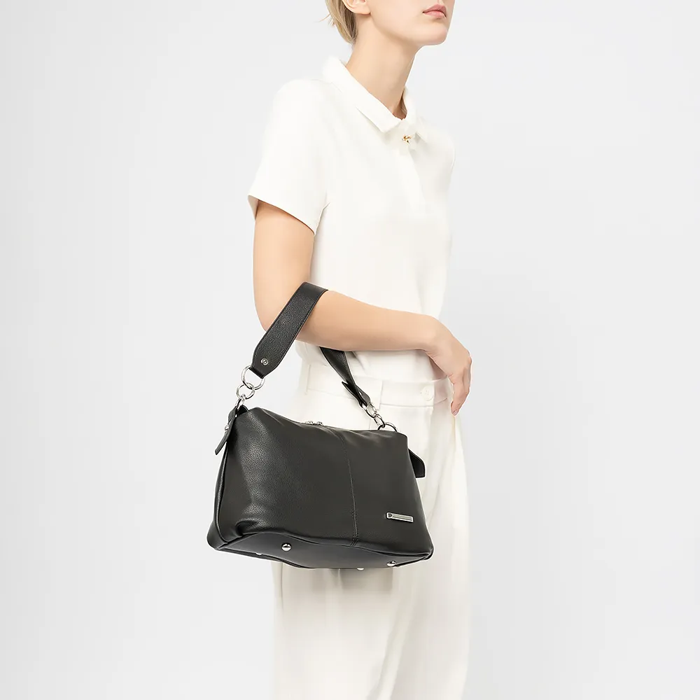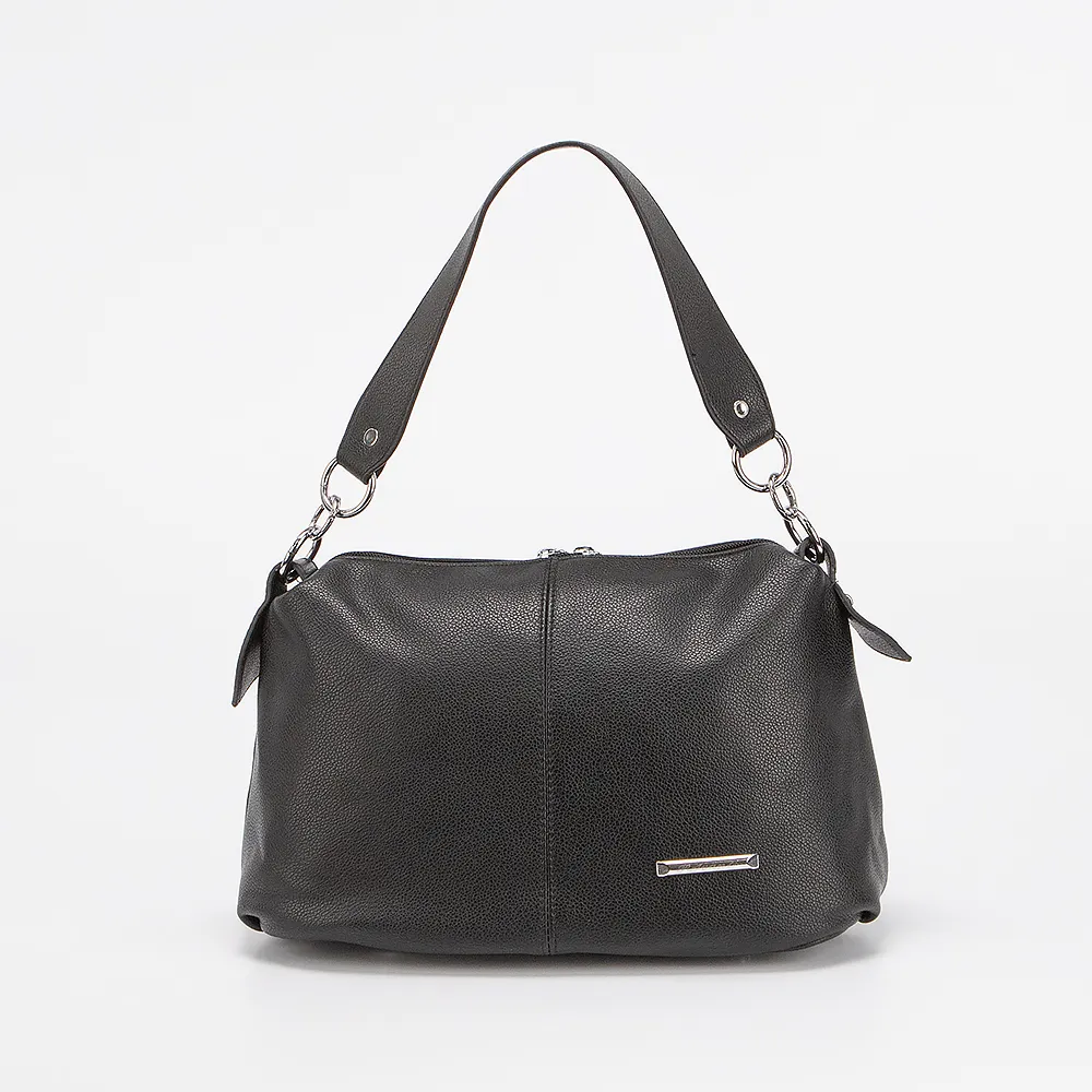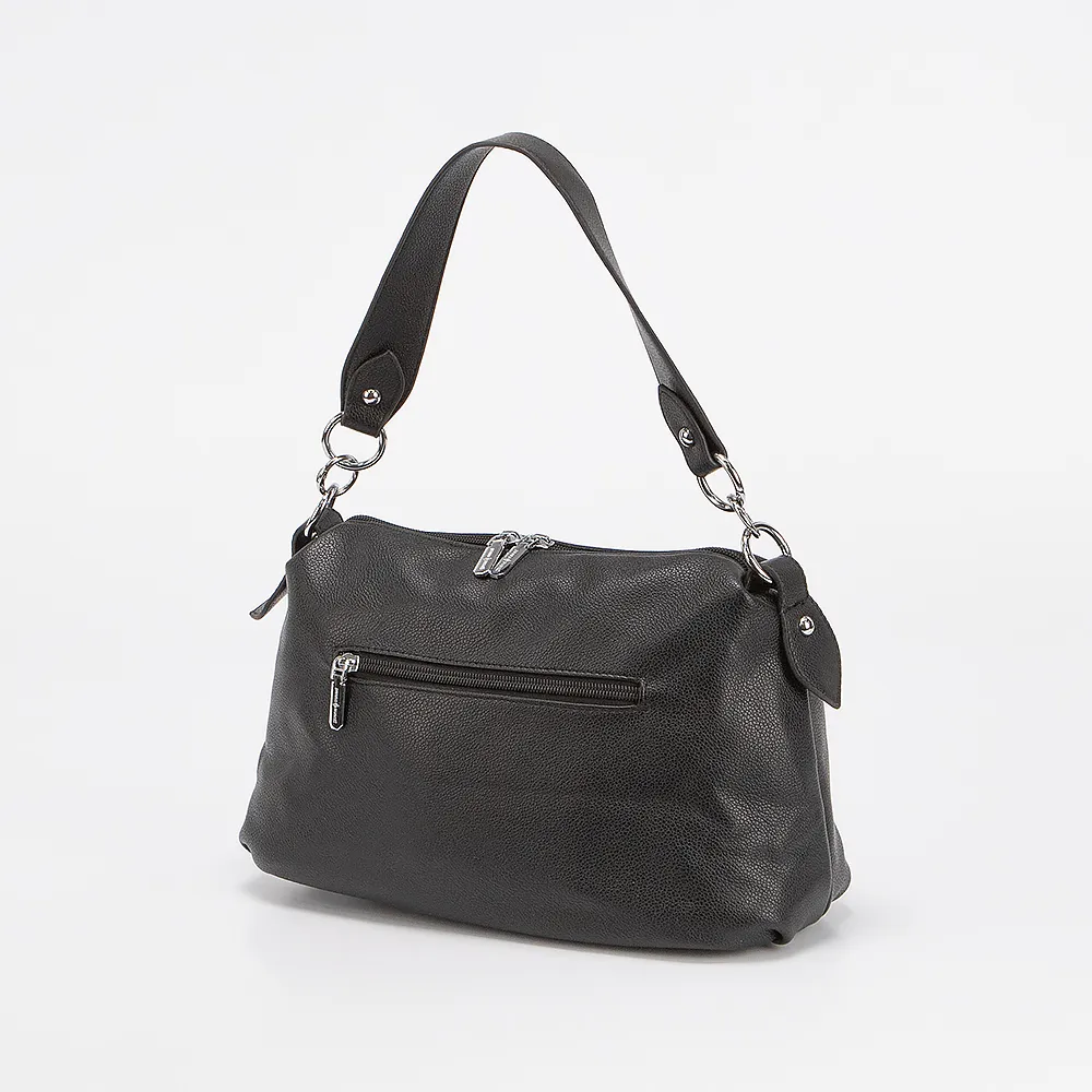 Сумка от торговой марки Passo Avanti из искусственной кожи черного цвета. Модель с длинной ручкой и съемным регулируемым плечевым ремнем. Отделение на молнии. Внутри: текстильная подкладка, карман на молнии, накладной карман. На задней стороне - карман на молнии. Дно оснащено металиическими ножками для защиты от износа.