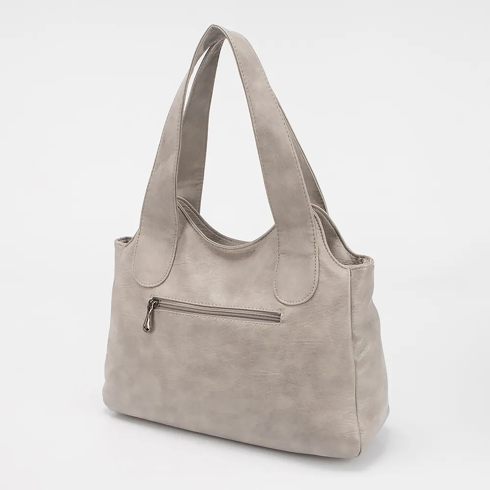 Сумка от торговой марки Passо Avanti из искусственной кожи бежевого цвета. Модель с двумя длинными широкими ручками. Отделение на молнии. Внутри: текстильная подкладка, карман на молнии, накладной карман. На лицевой стороне два кармана на молнии. На задней стороне - карман на молнии.